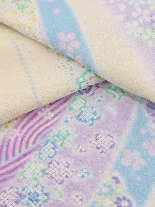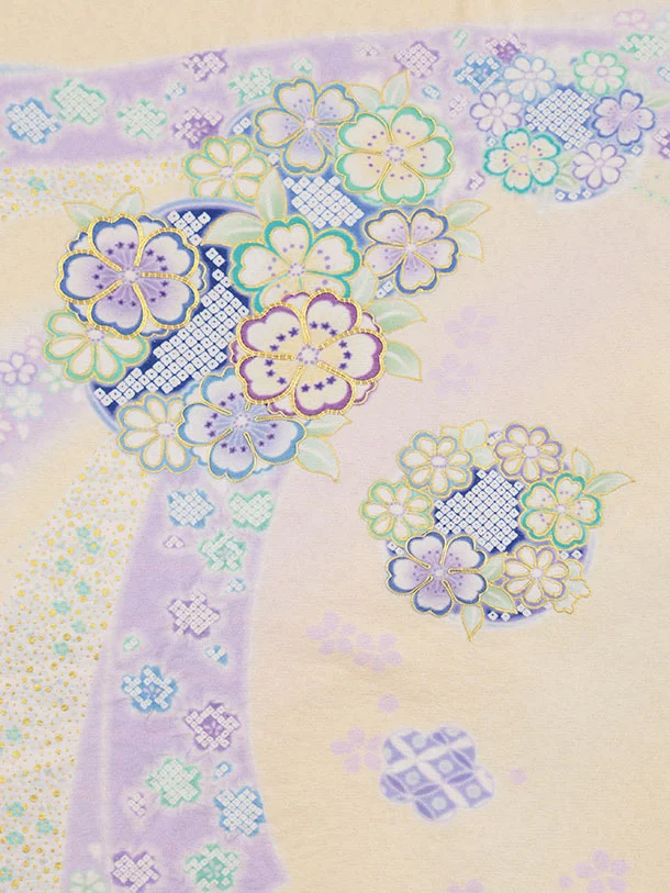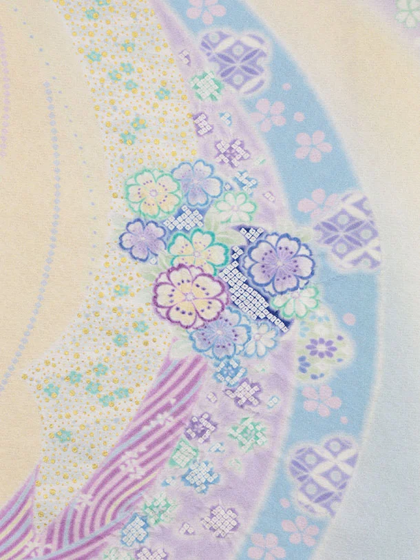 パステルカラーを使い可愛らしさを表現し染め上げ金箔、縫い締め絞りで立体感を出し、さらに金コマ刺繍をあしらい仕上げた滝泰おぼろ染の産着です。
