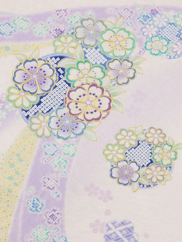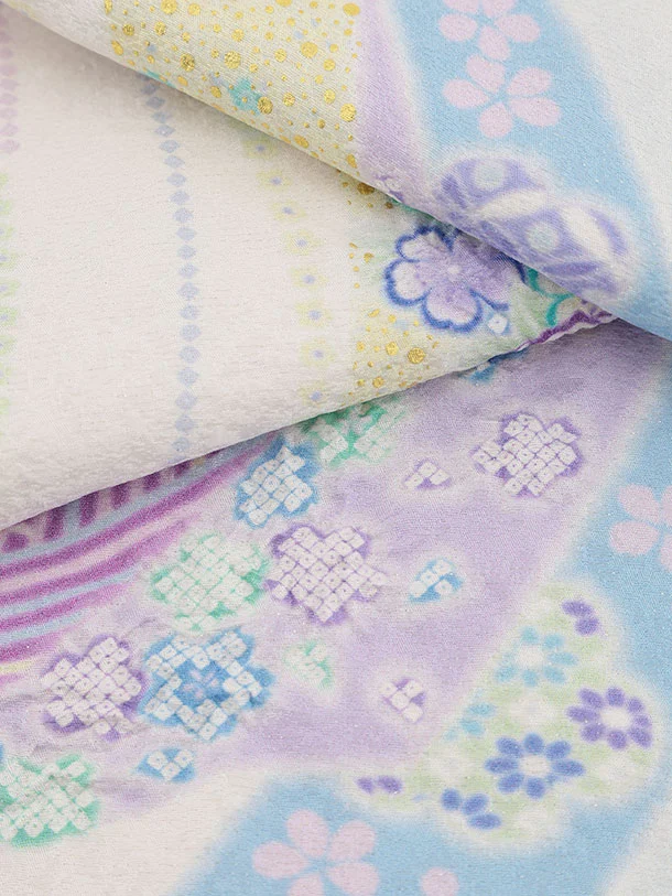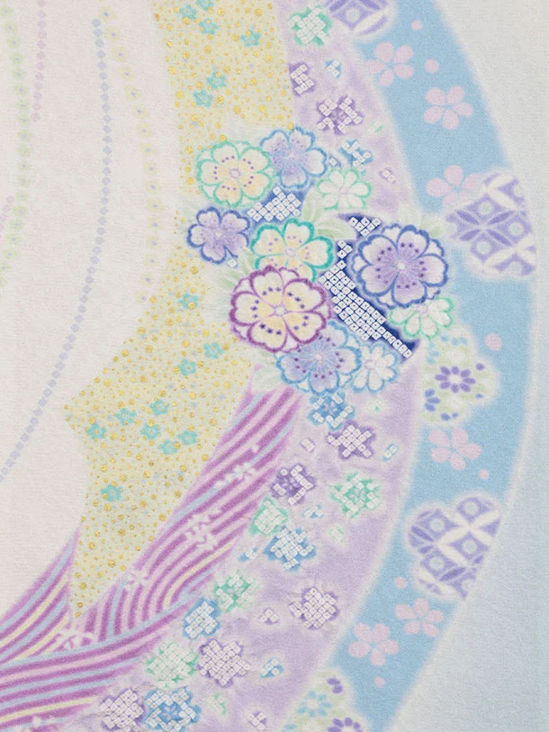 パステルカラーを使い可愛らしさを表現し染め上げ金箔、縫い締め絞りで立体感を出し、さらに金コマ刺繍をあしらい仕上げた滝泰おぼろ染の産着です。