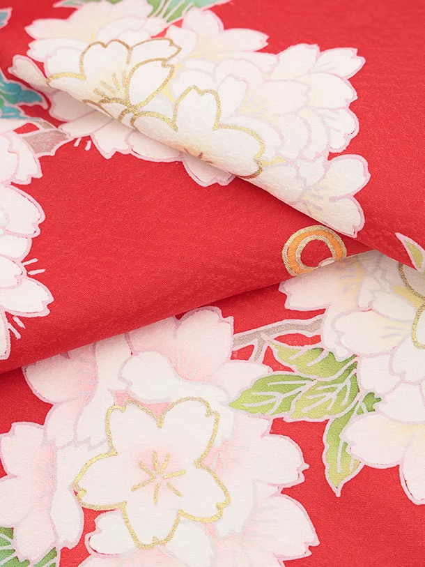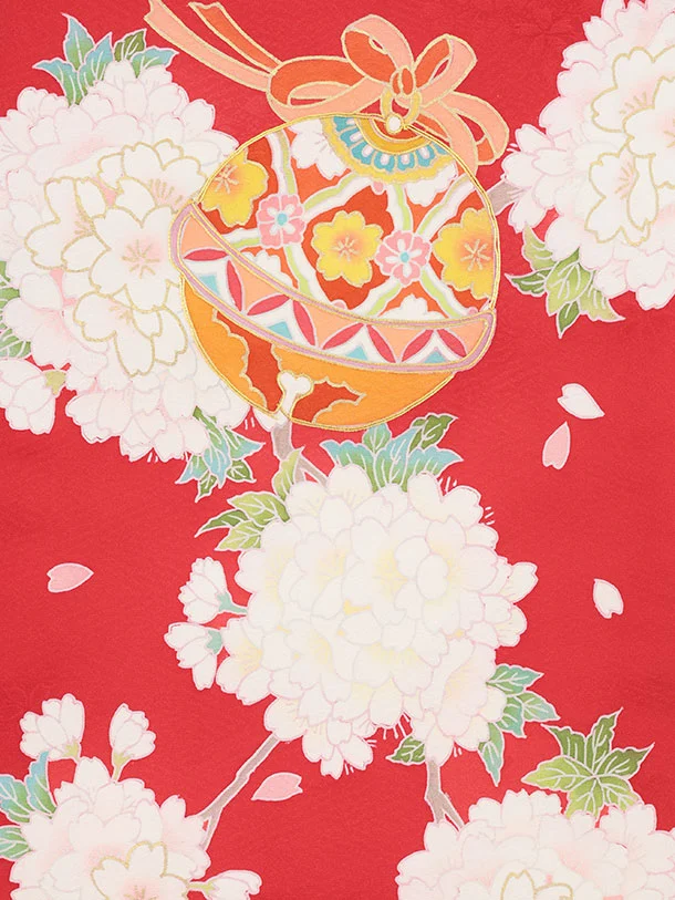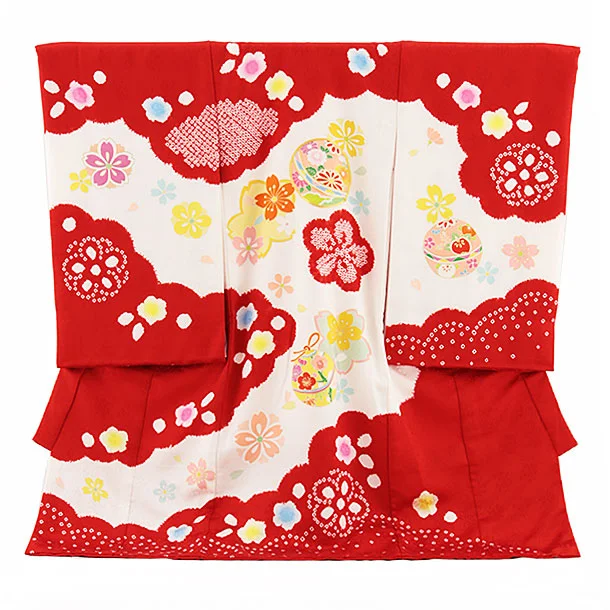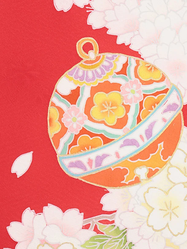 女児産着 お宮参りレンタル2978【正絹】 赤地 鈴に桜薬玉
