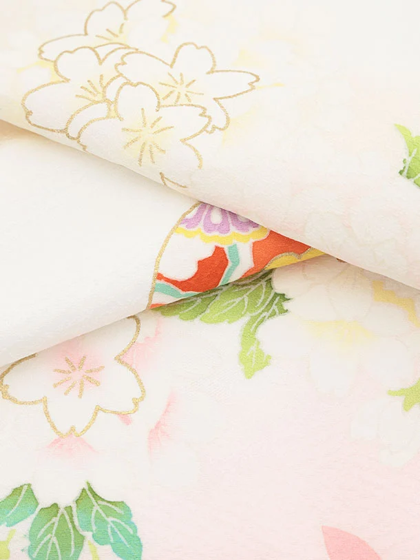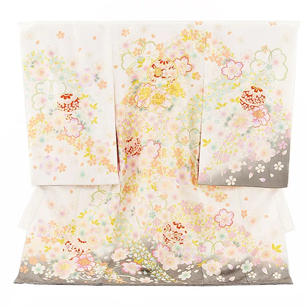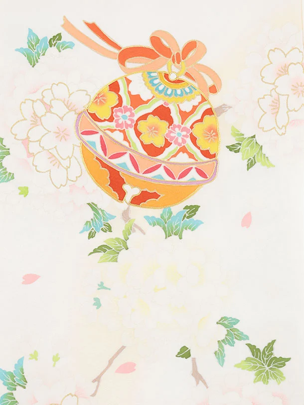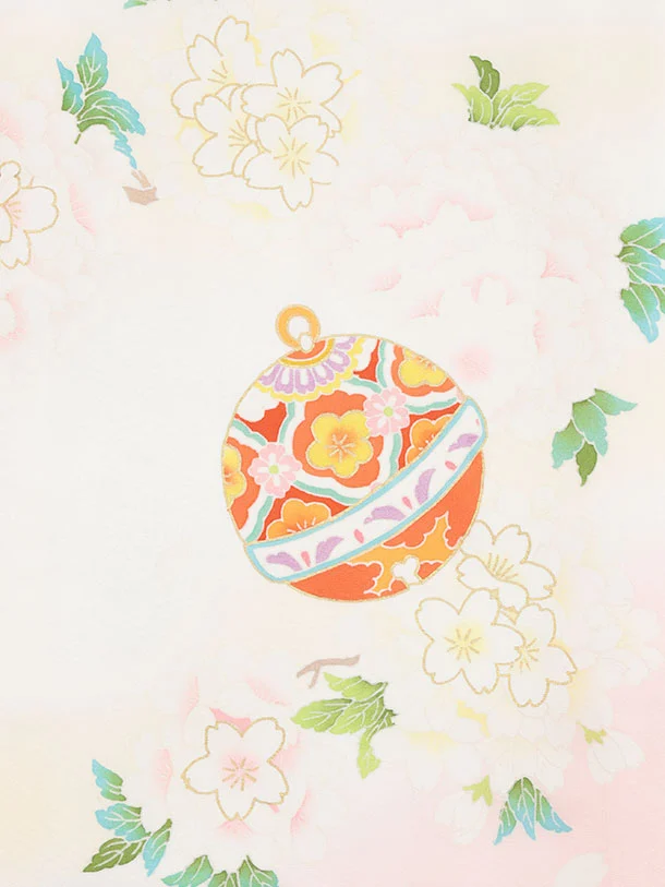 女児産着 お宮参りレンタル2980【正絹】 白地裾ピンク 鈴に桜薬玉