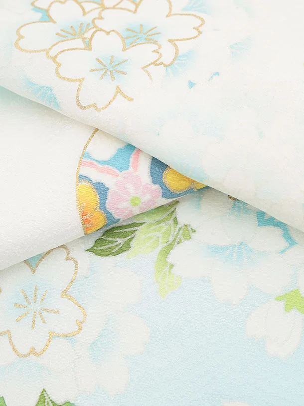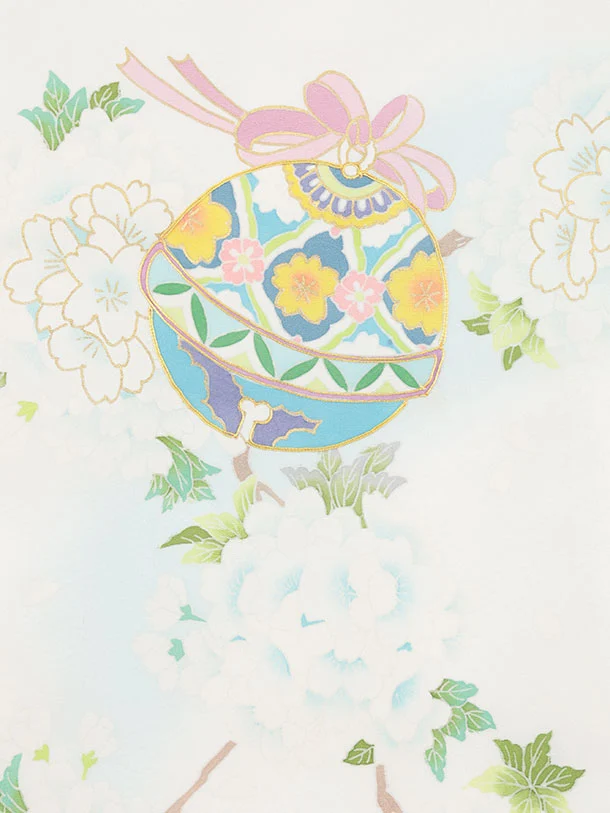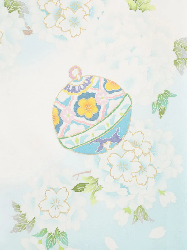 女児産着 お宮参りレンタル2981【正絹】 白地裾水色 鈴に桜薬玉
