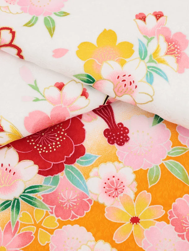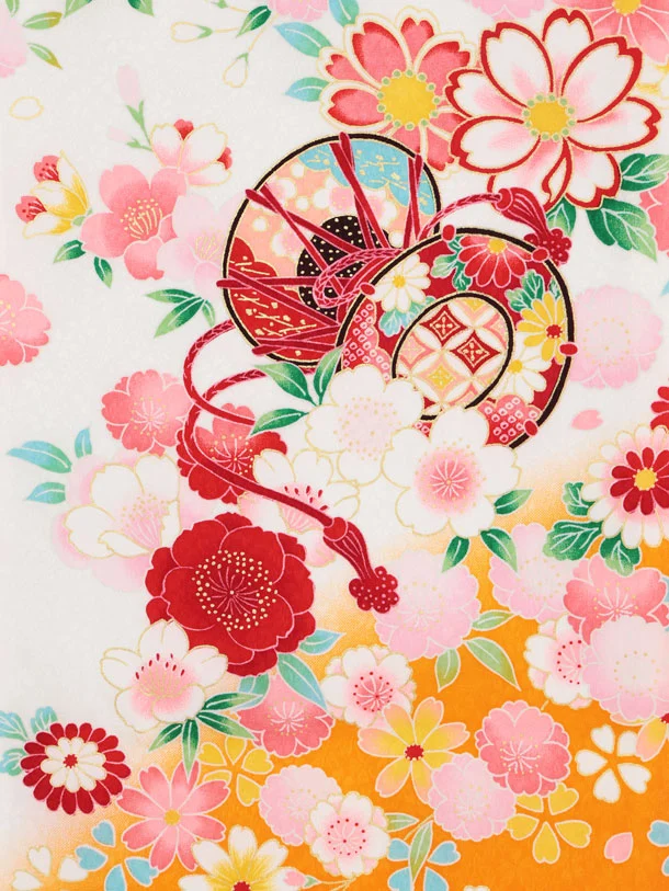 女児産着 お宮参りレンタル2986【正絹】 白地裾オレンジ 鞠に花づくし