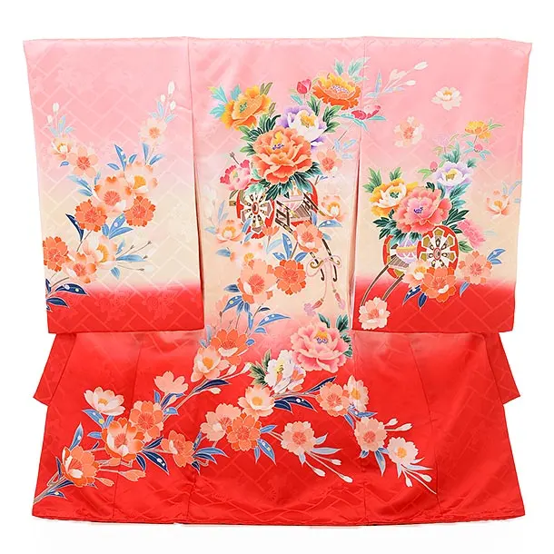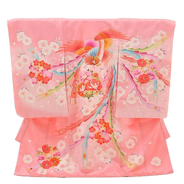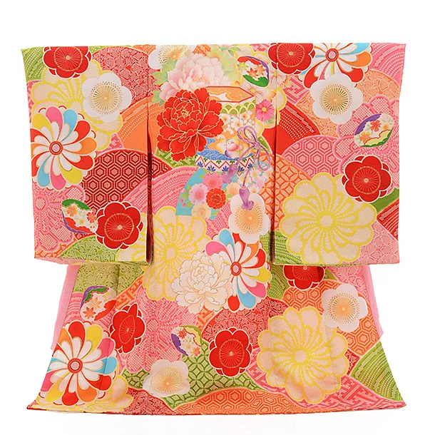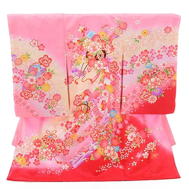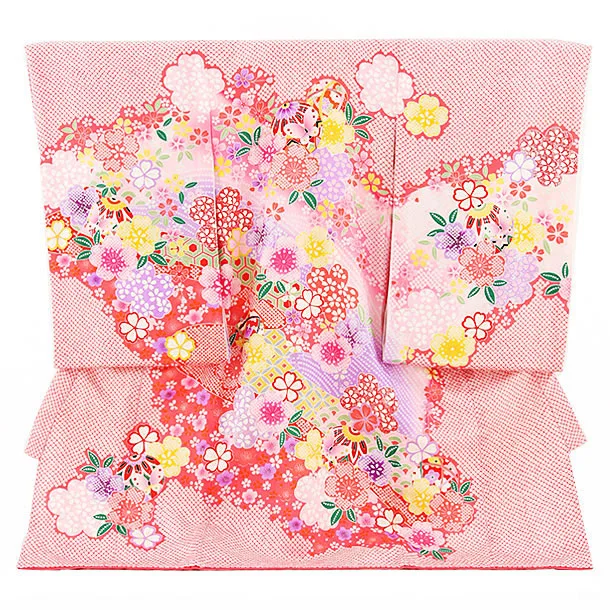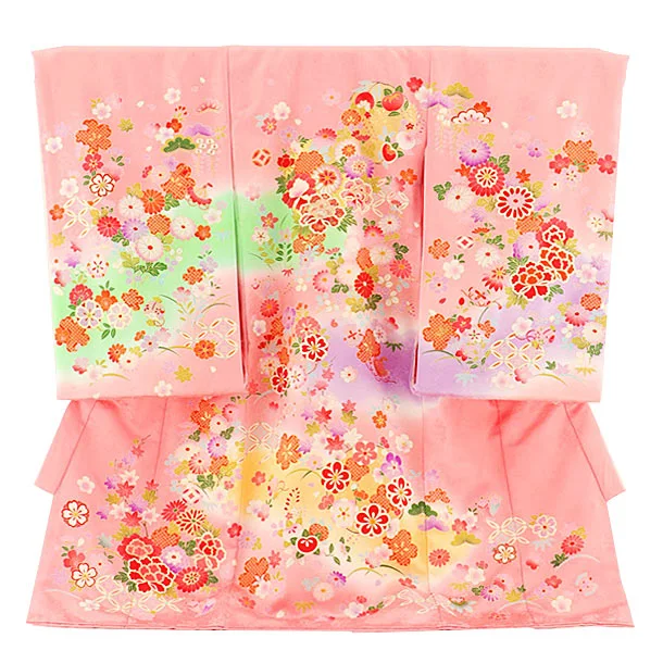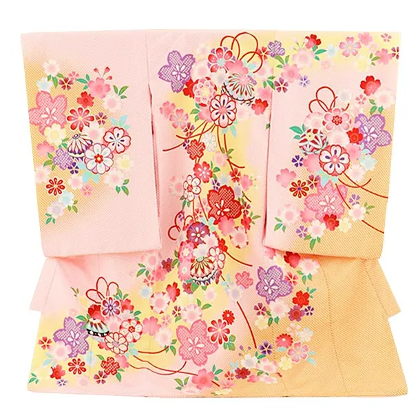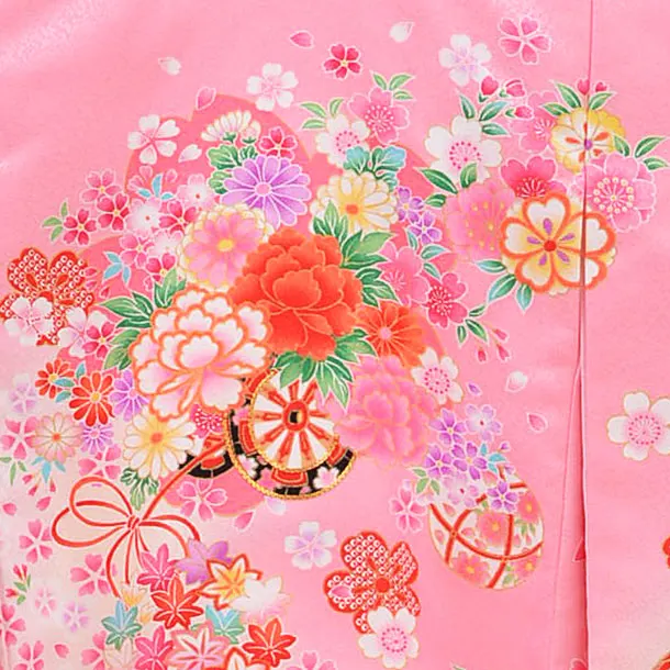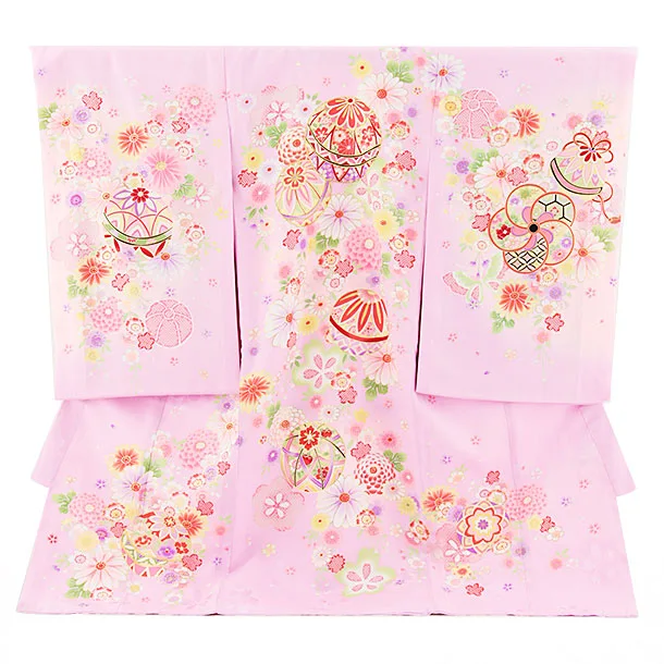 ピンク地に、桜などの花柄や、鞠(まり)が散りばめられた、可愛らしいデザインのお着物です。明るく優しいピンクの色味がより一層可愛らしさを引き立てます。