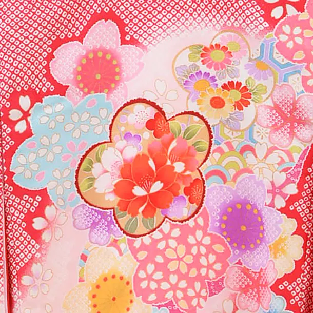 濃いピンクの絞り柄に、色とりどりの花々が描かれたお着物です。明るく可愛らしい色使いの中に古典的な花柄が上品な雰囲気を添えます。
