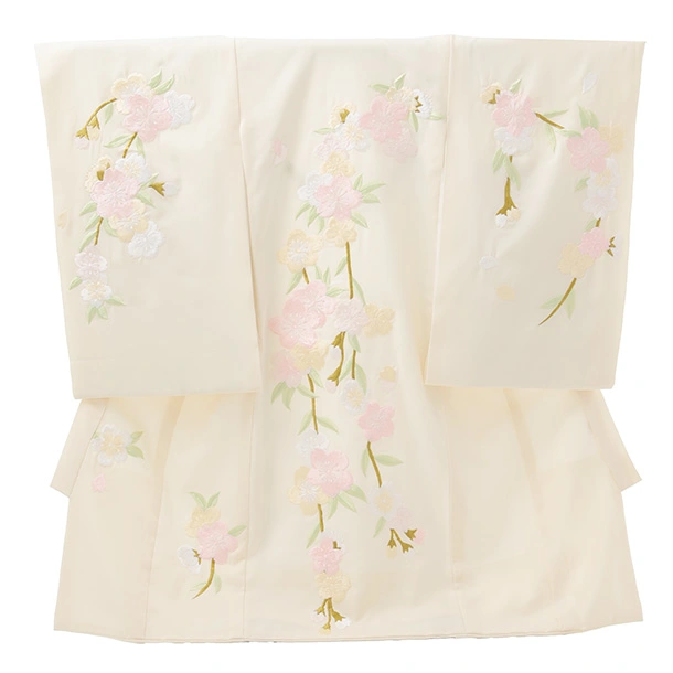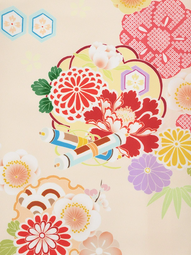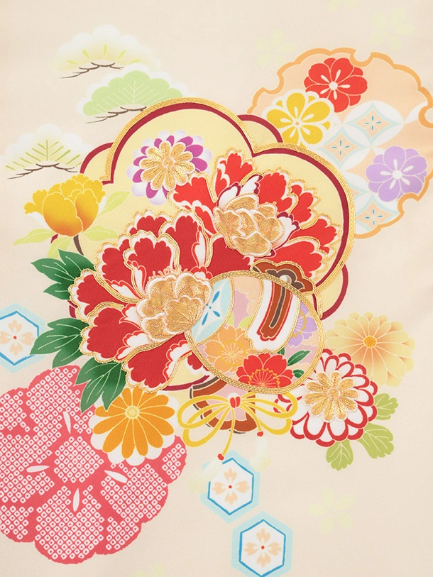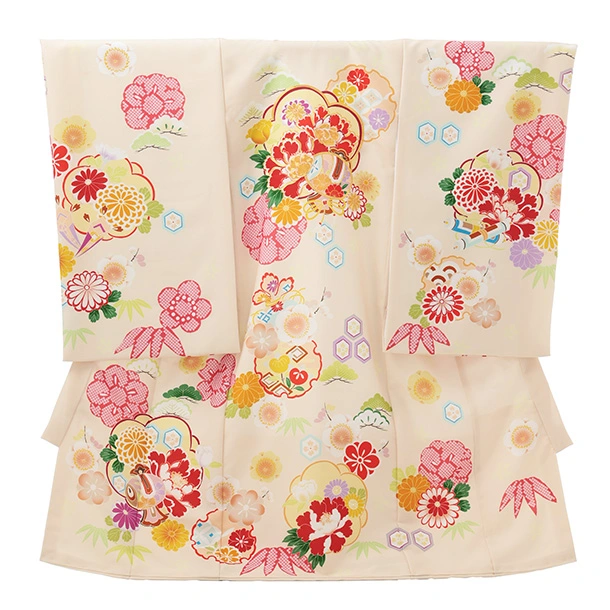女児産着 お宮参りレンタルR024 ベージュ地 牡丹に松竹梅