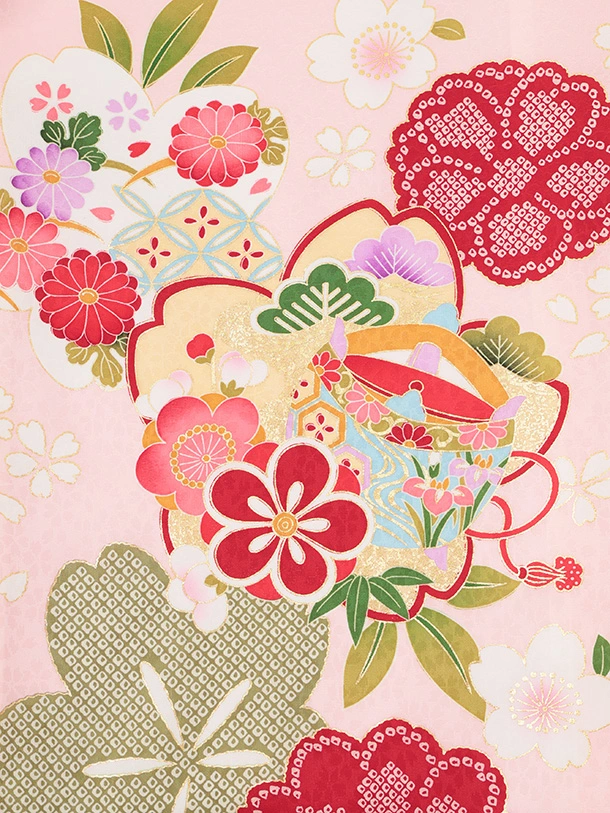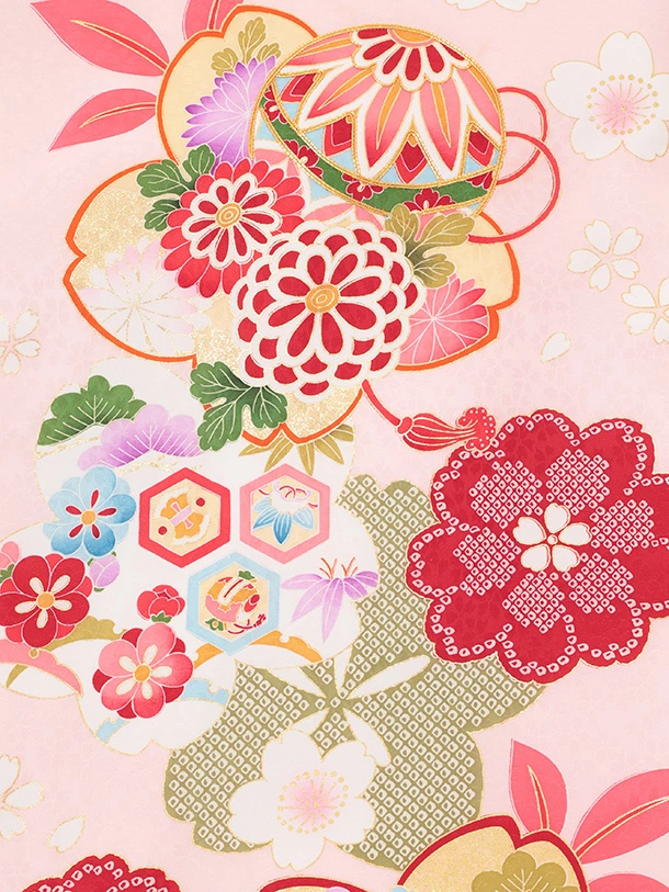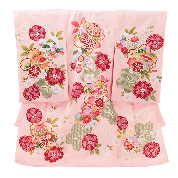 女児産着 お宮参りレンタルR053 【正絹】ピンク地 桜にまり