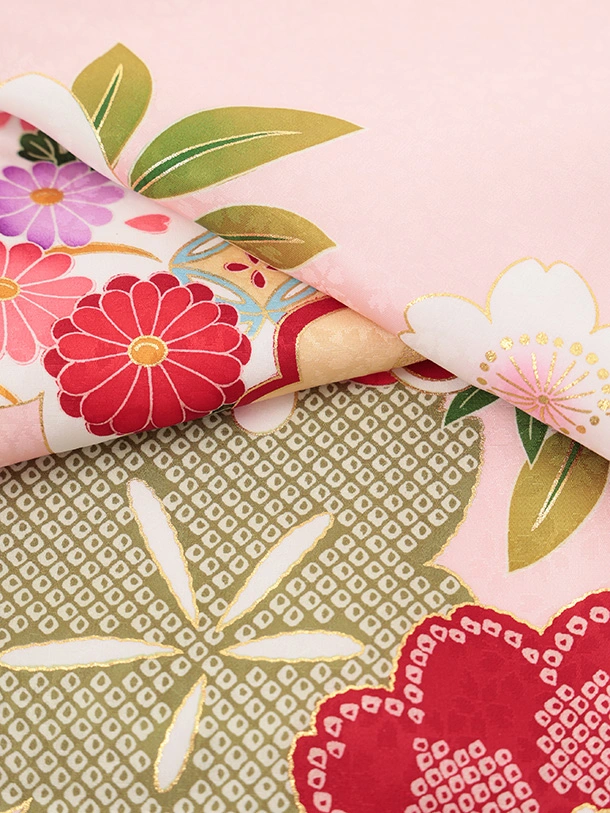 お祝い着をかける時は 絵柄がよく見える様に広げ抱いた子供の体を覆う様に掛け産着の付紐の一方を肩側から他方を脇から通して 抱き手の方の背で蝶結びにします。