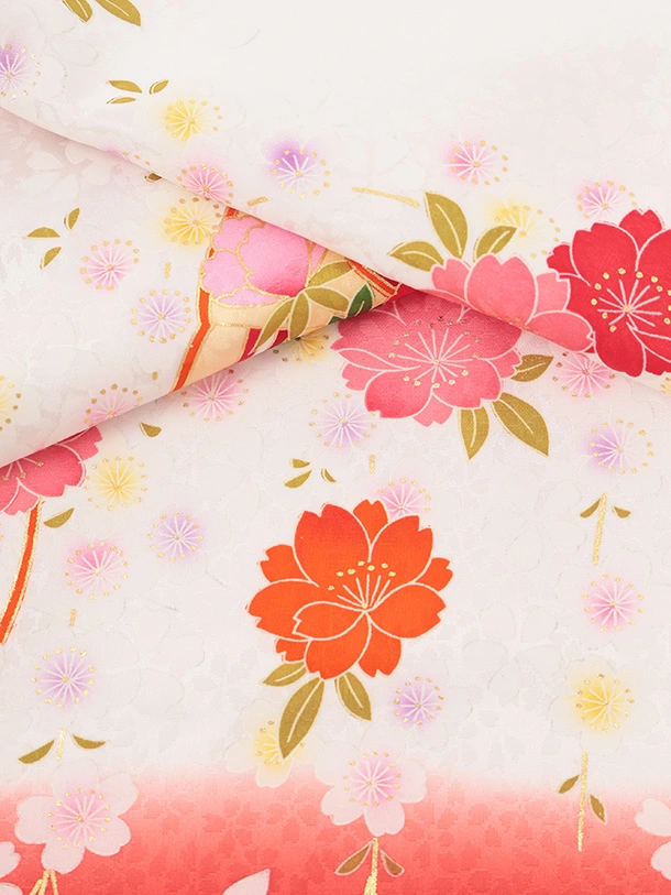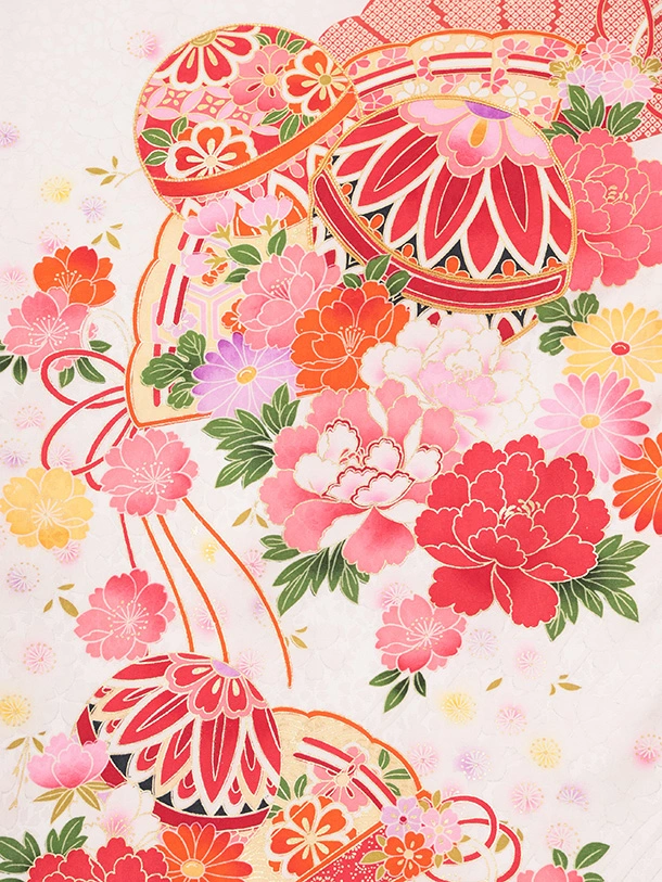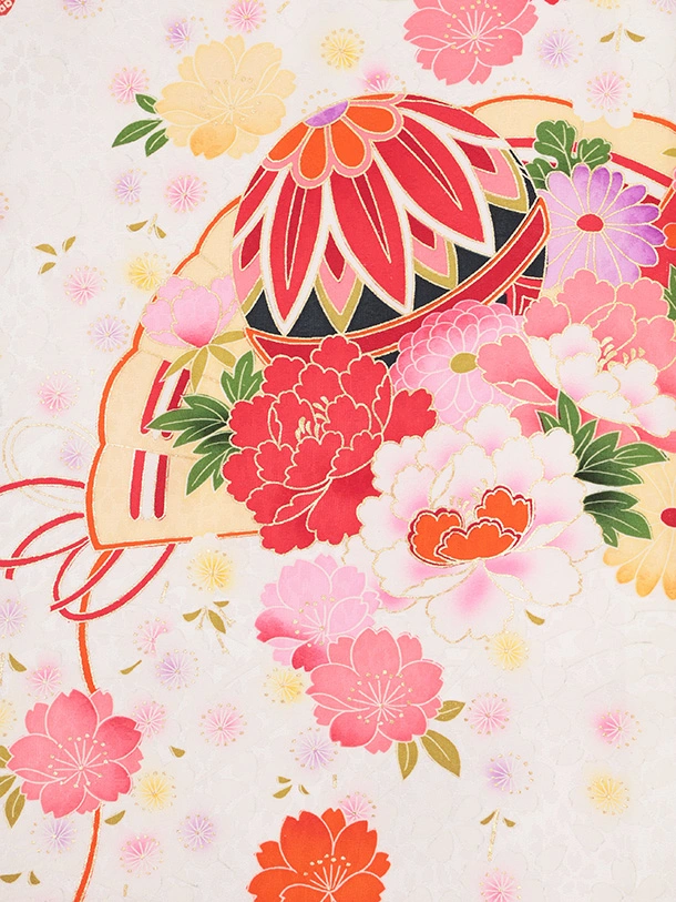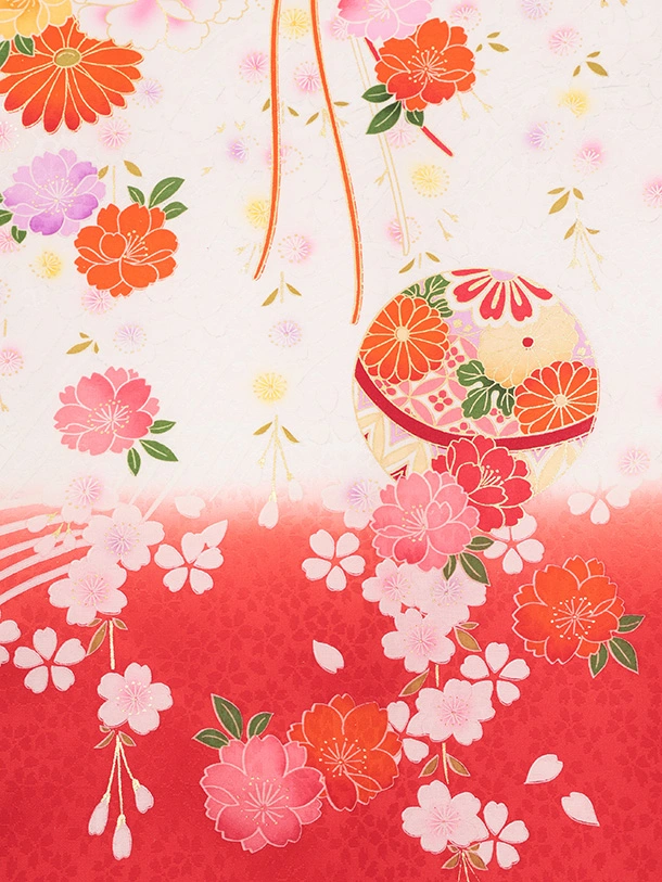 女児産着 お宮参りレンタルR055 【正絹】白地 裾赤 扇 鞠と花
