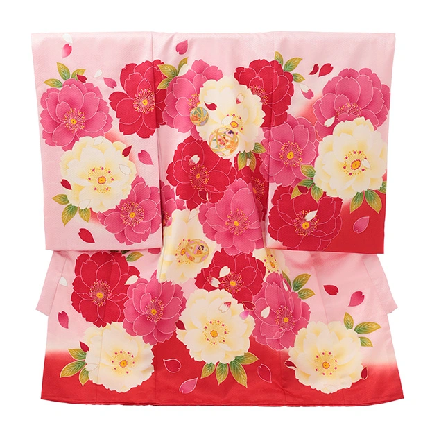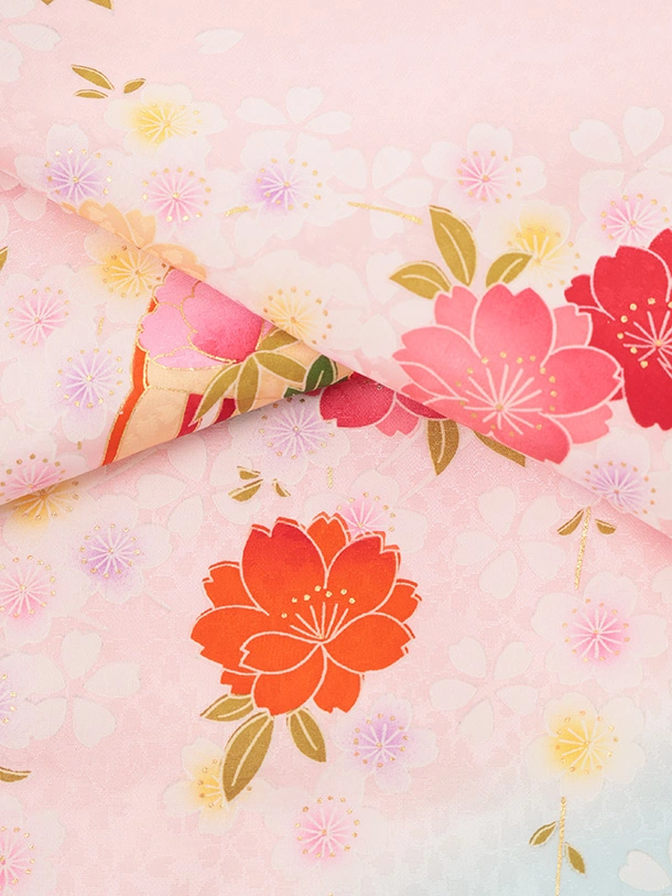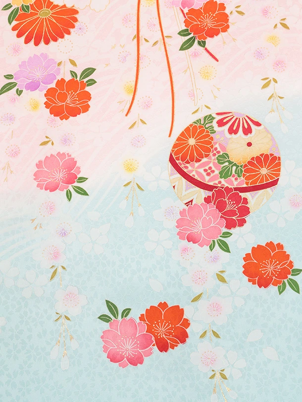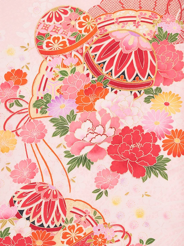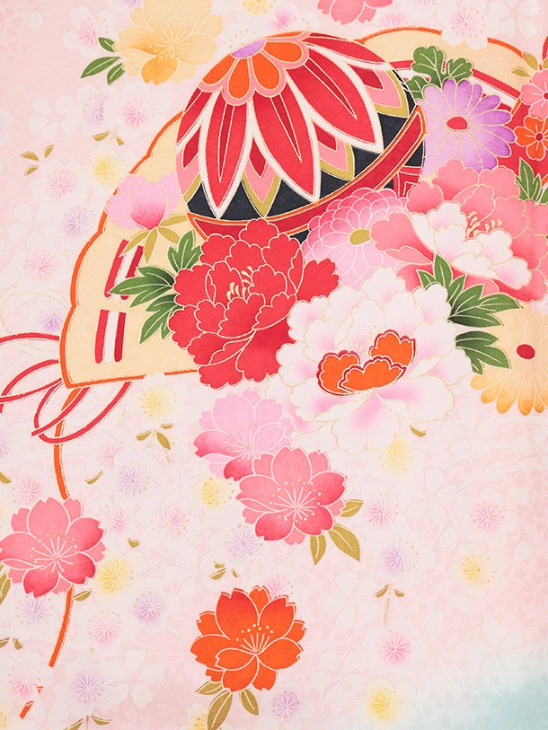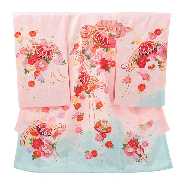 女児産着 お宮参りレンタルR056 【正絹】ピンク地 裾水色 扇 鞠と花