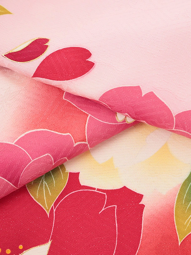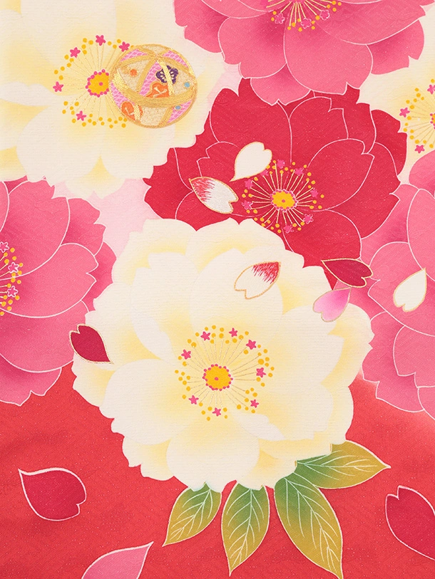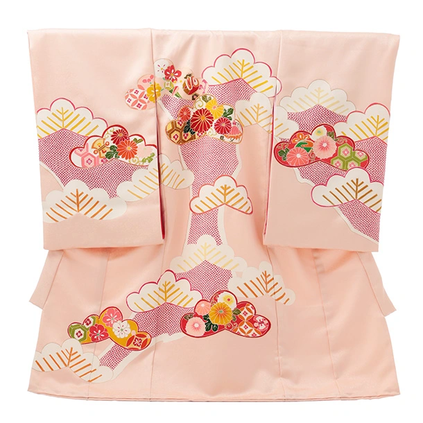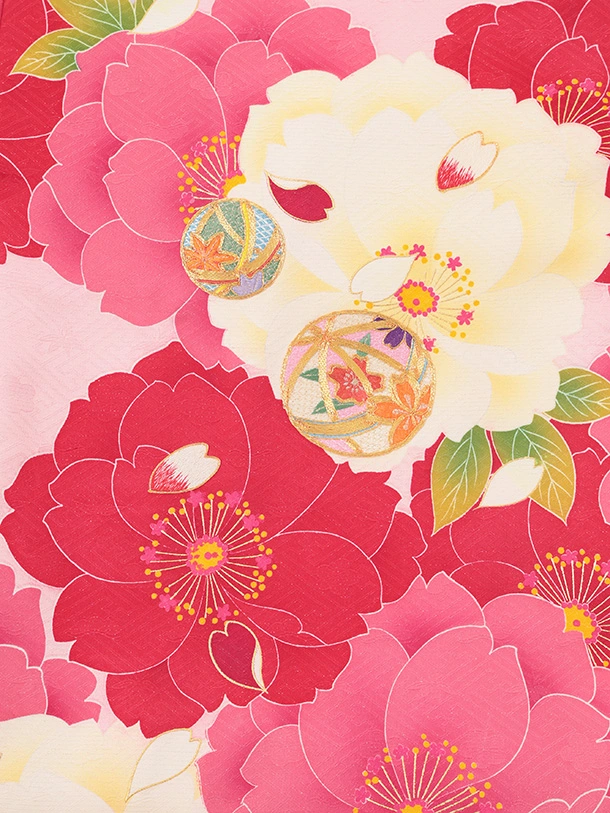 女児産着 お宮参りレンタルR061 【正絹】ピンク地 裾赤 刺繍鞠 大花