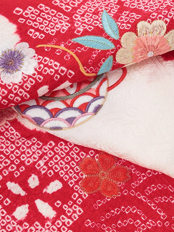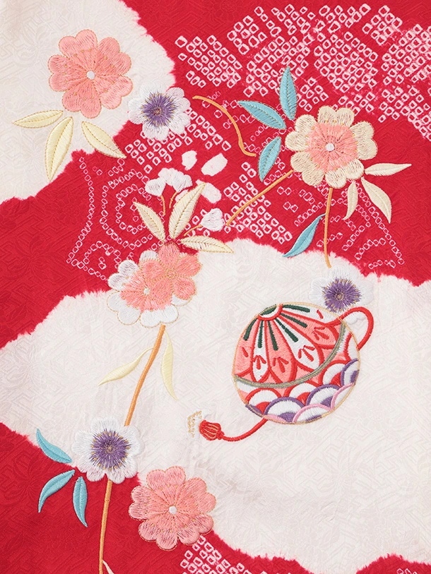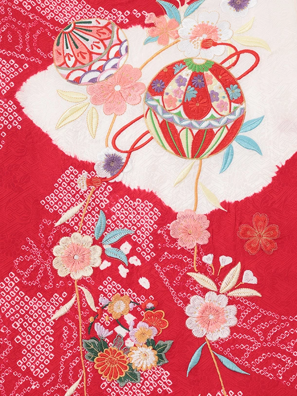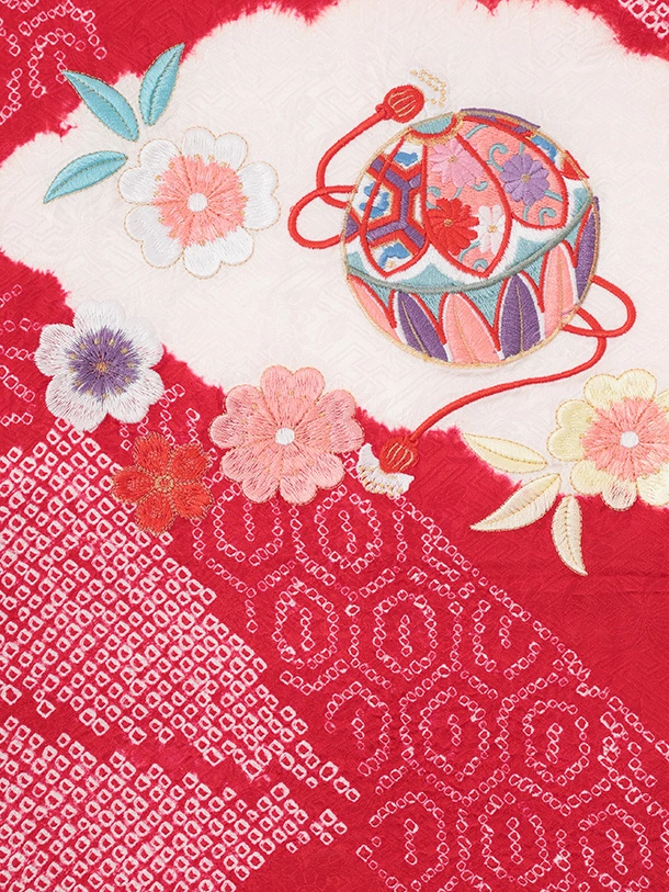 女児産着 お宮参りレンタルR063 【正絹】赤地 雲取り 刺繍鞠と熨斗