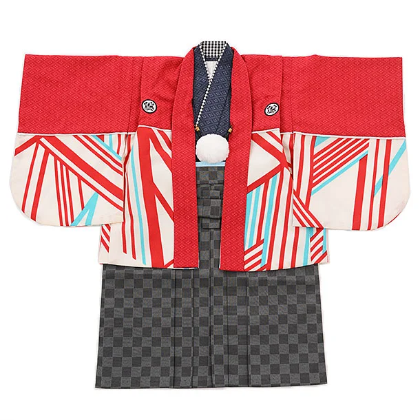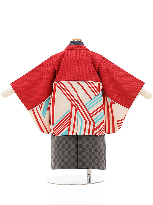 男児【1歳前後】0082 赤白紋付xグレー市松袴