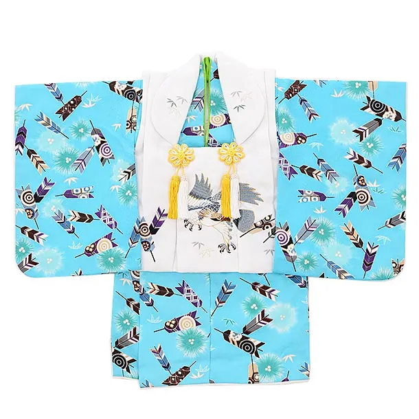 男児【100日~1歳用】0090白 ししゅう 鷹 x 水色 矢羽根
