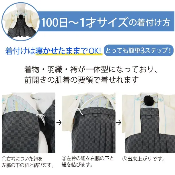 羽織・着物・袴が繋がった一体型になっており、赤ちゃんの肌着のように簡単に着せることができます。