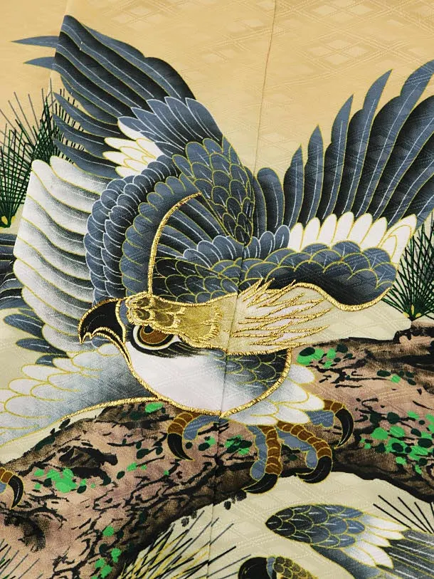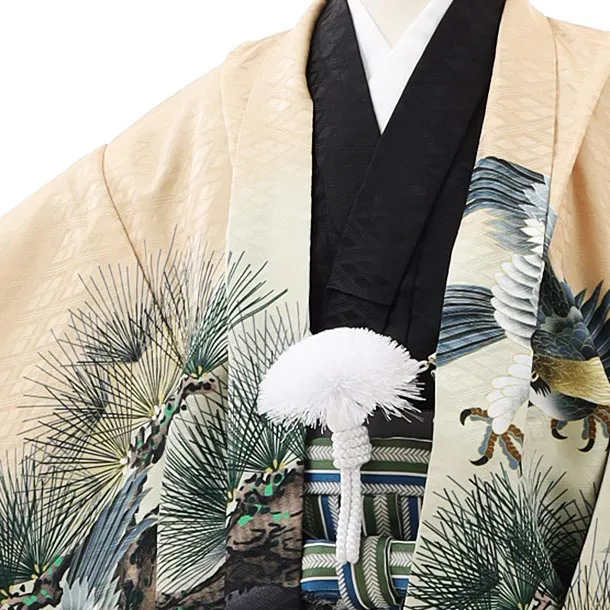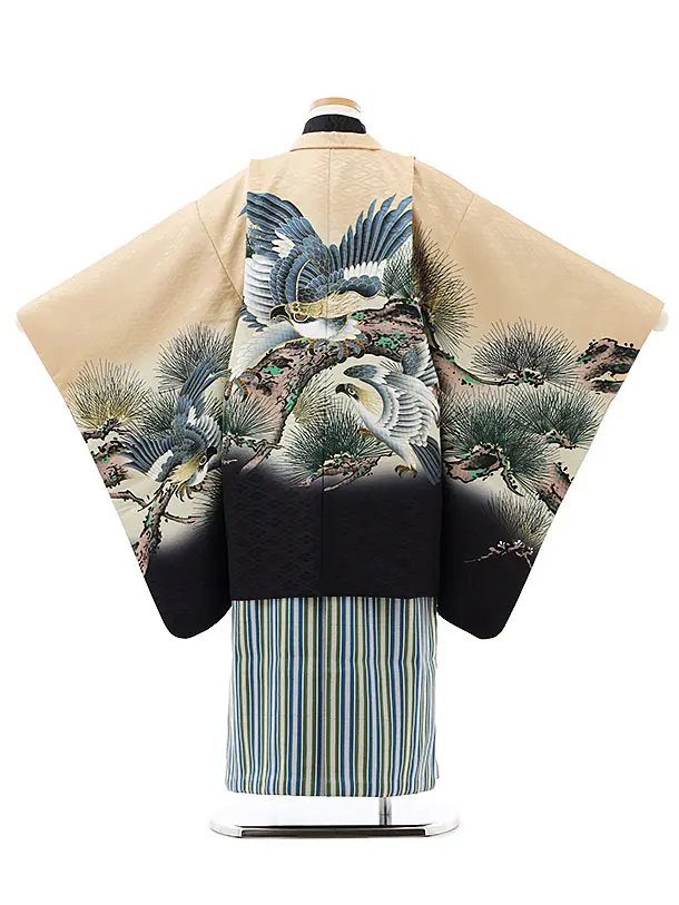 七五三レンタル(7歳男袴)0836薄キャメル色松に鷹xグリーンストライプ袴