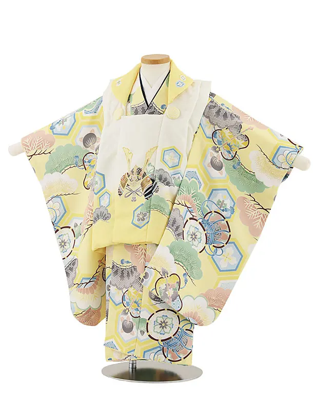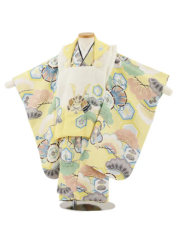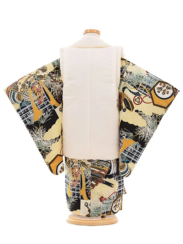 七五三レンタル(3男被布)2126 クリーム色×黒地 松兜