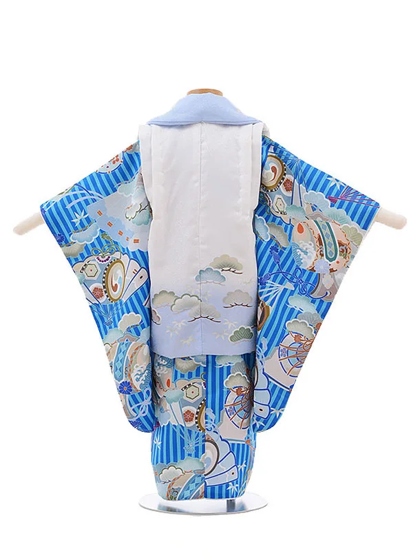 七五三レンタル(3男被布)2172花うさぎ白ブルーぼかし×ブルーストライプ