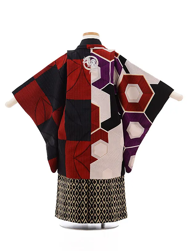 七五三(3歳男袴)2195 蒼 赤市松 ベージュ 亀甲 アシンメトリー