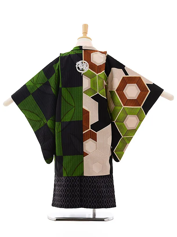 七五三 3歳男袴 2196 蒼 グリーン市松 ベージュ 亀甲 アシンメ