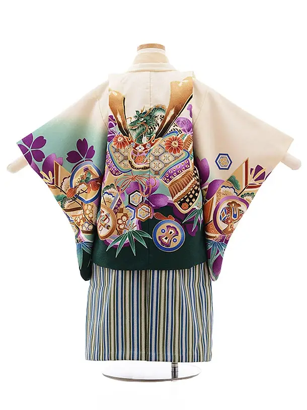 かんたん七五三(3歳男児袴)2277クリーム色丸紋かぶと×グリーンストライプ