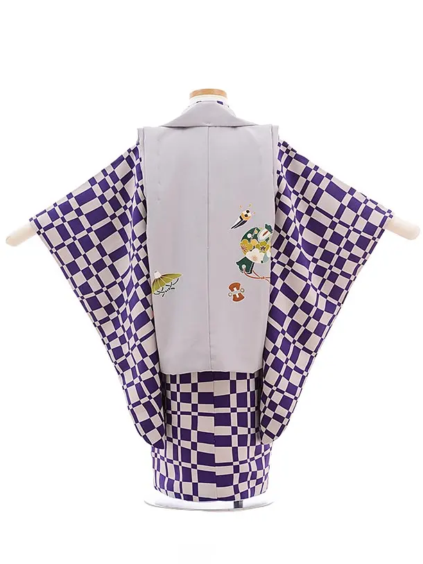 七五三レンタル(3歳男児被布) 正絹 2304 淡グレー寿柄×パープル格子