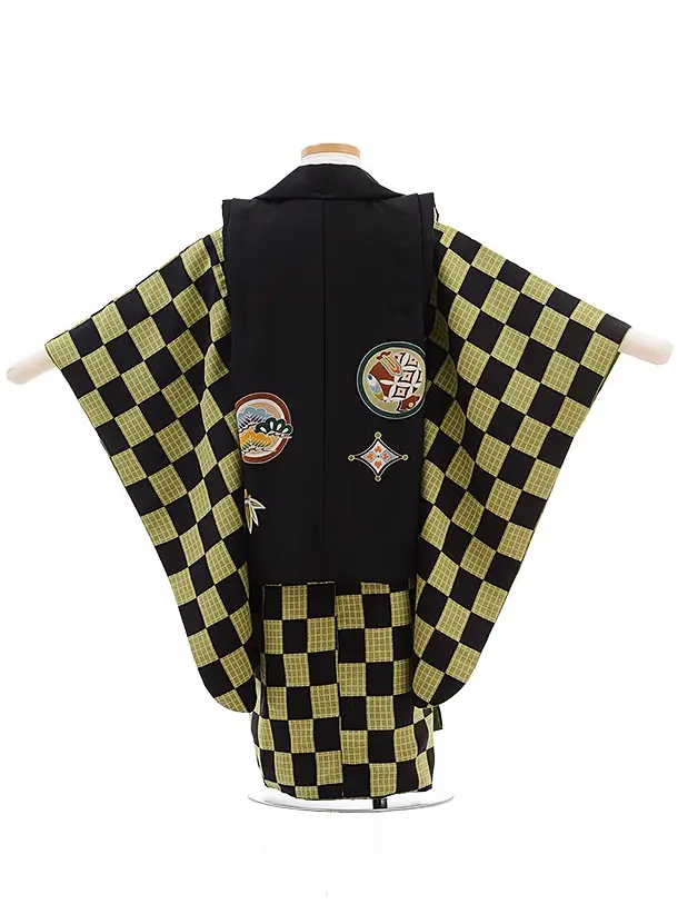 七五三レンタル(3歳男児被布) 正絹 2305 黒地 鷹×黒グリーン市松