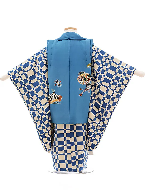七五三レンタル(3歳男児被布) 正絹 2311 ブルー地 かぶと×ブルー格子