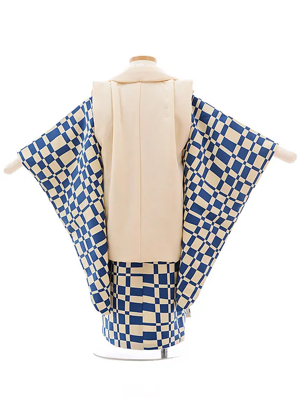 七五三レンタル(3歳男児被布) 正絹 2318 クリーム色×ブルー格子