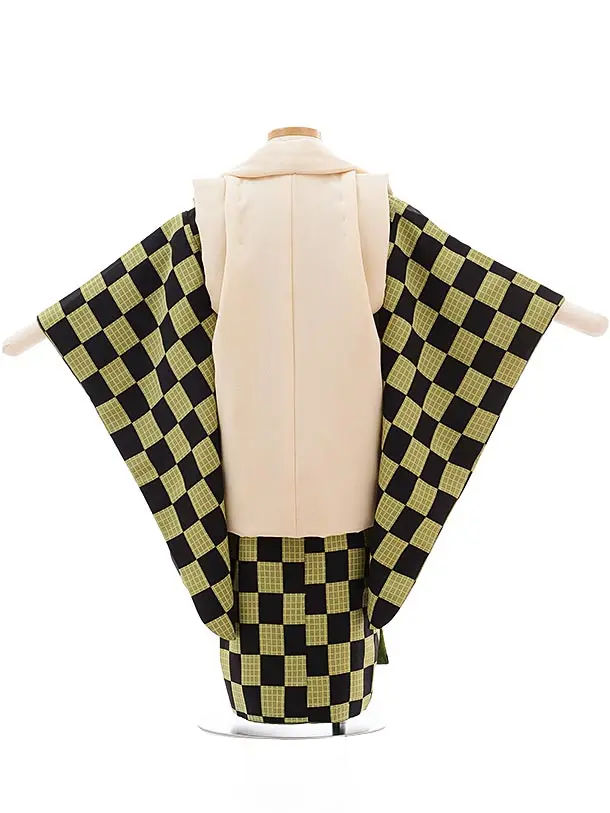 七五三レンタル(3歳男児被布) 正絹 2323 クリーム色×黒グリーン市松