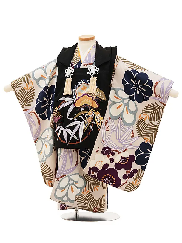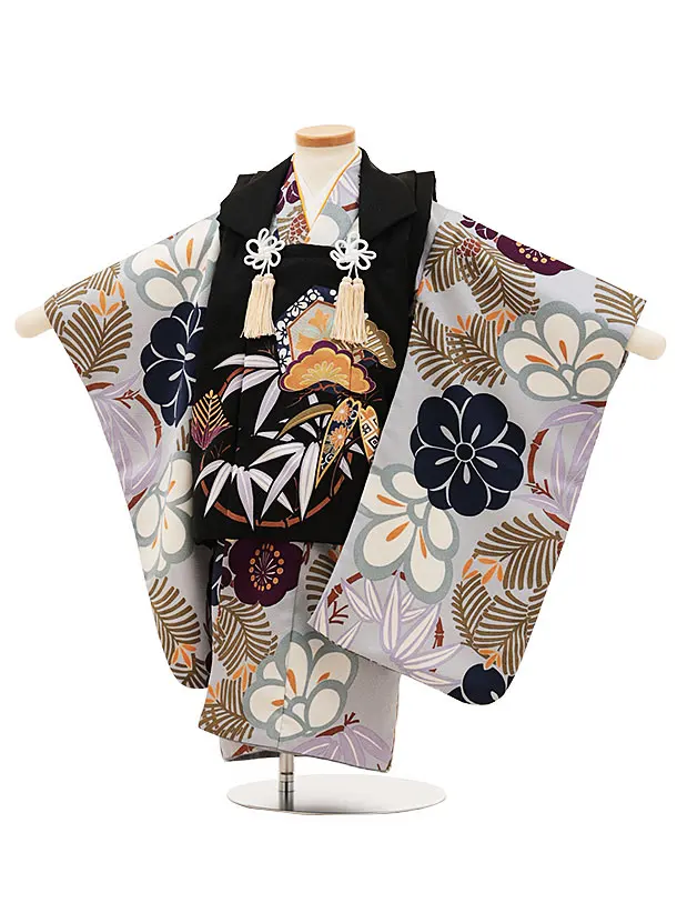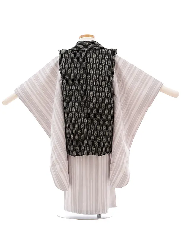 七五三(3歳男被布) 2341 黒 矢柄 かぶと 刺しゅう×グレーストライプ