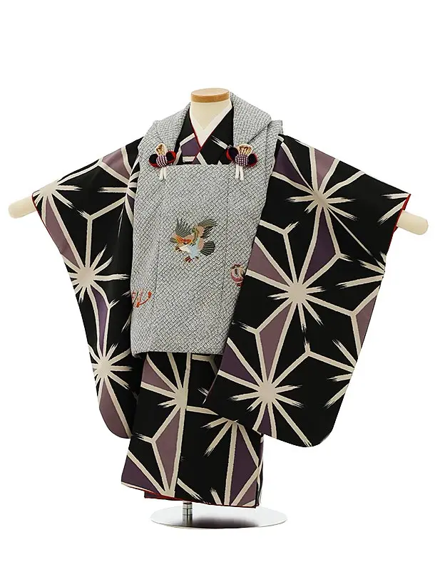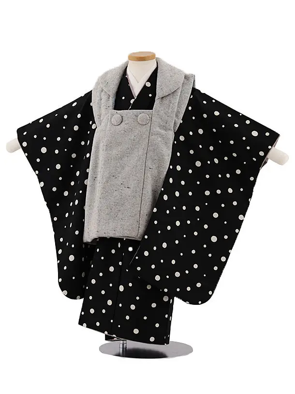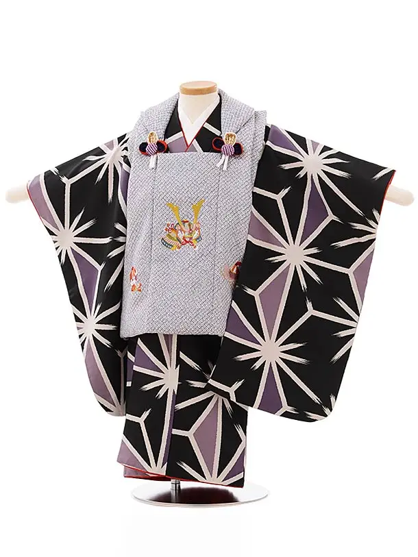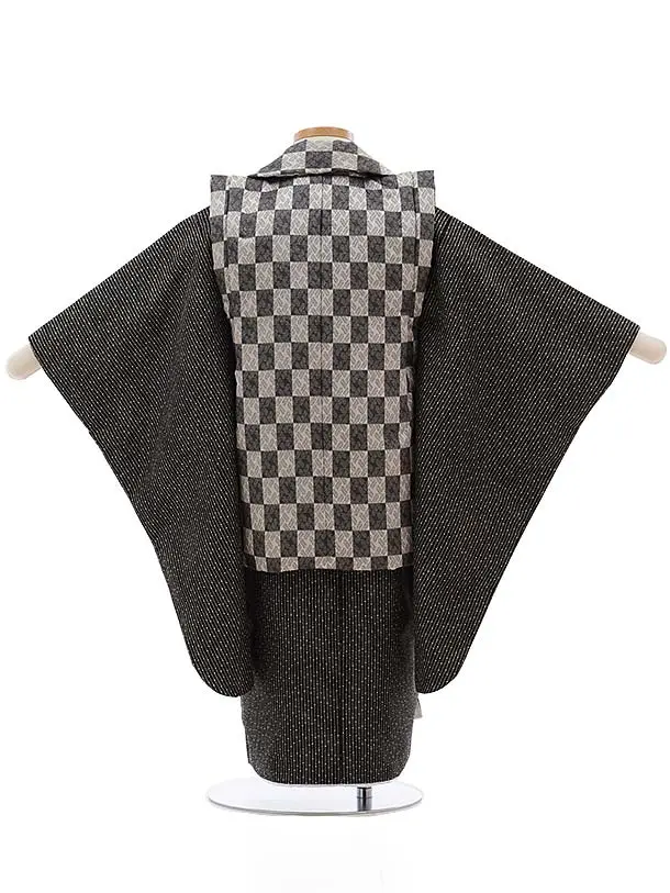 七五三レンタル(3歳男児被布)2372 グレーラメ市松×黒 変わりストライプ