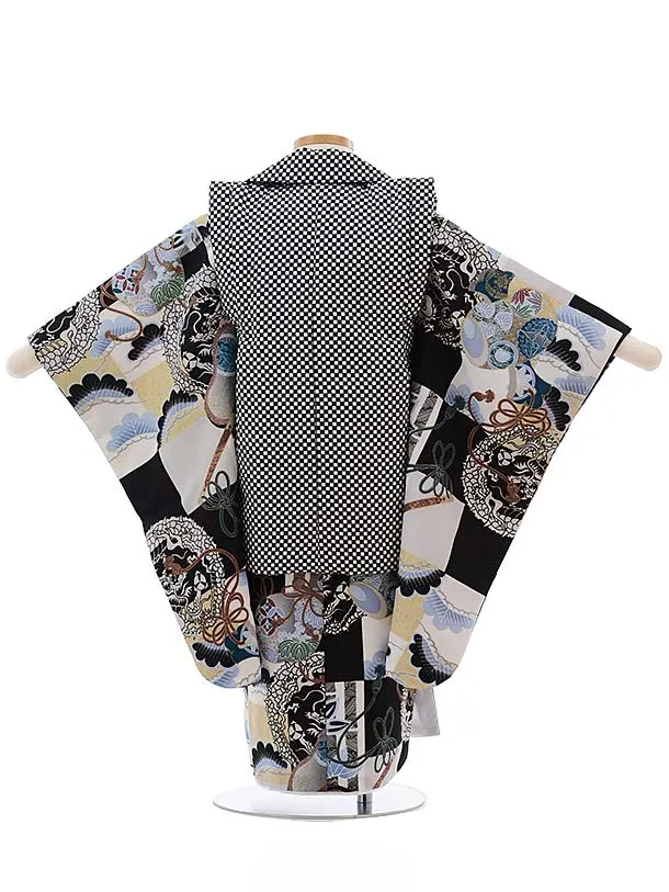 七五三レンタル(3歳男児被布)2374 黒白市松×黒白地 龍