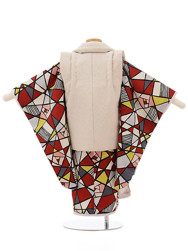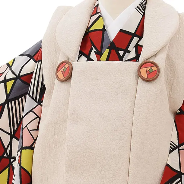 七五三(3歳男児被布)2392 ラフィネココ グレージュx 白赤モダン柄