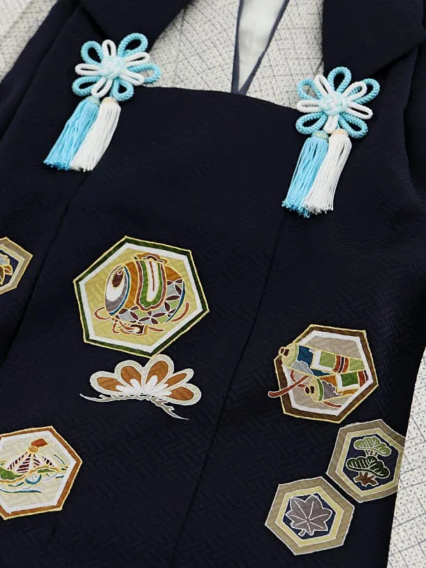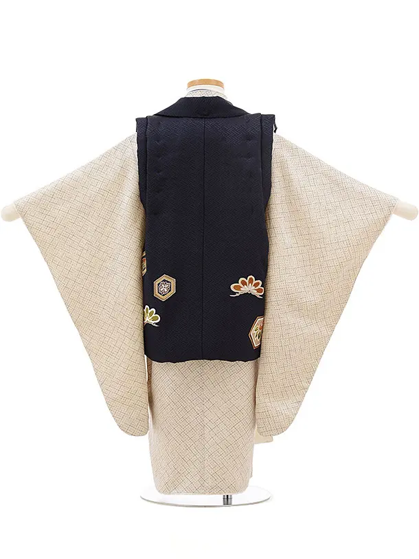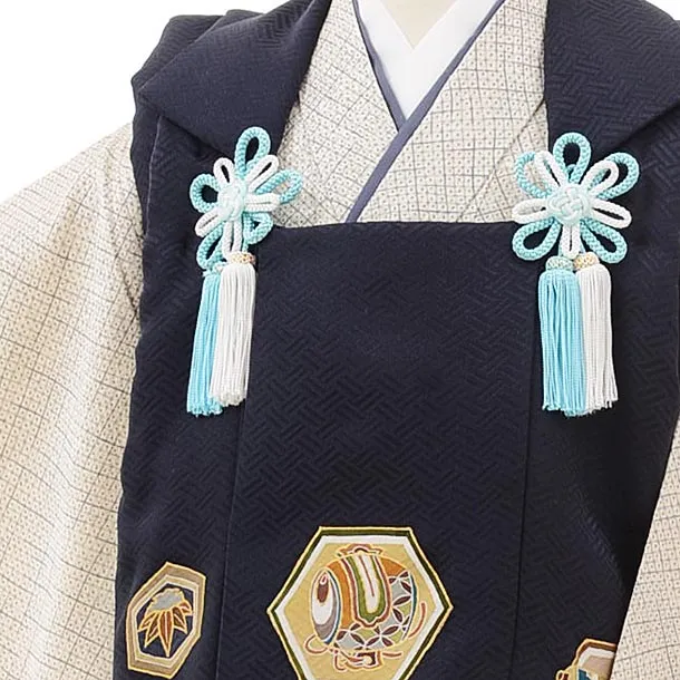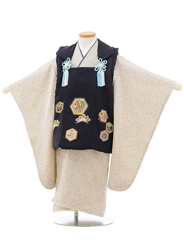 七五三レンタル(3歳男児被布)正絹2407紺亀甲小槌×グレー疋田柄