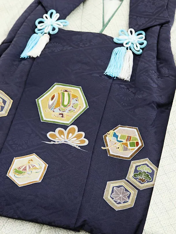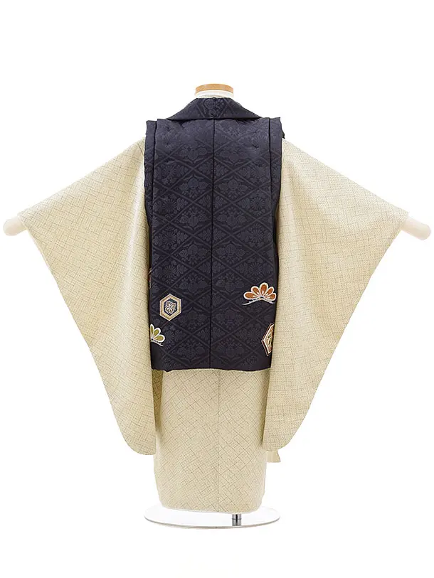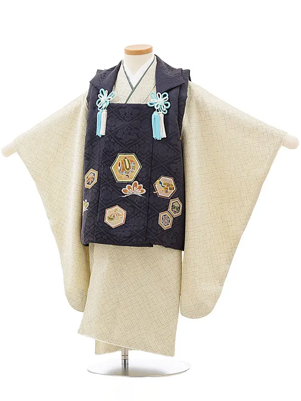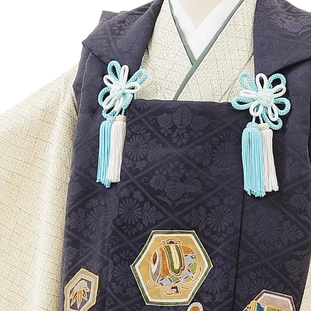 七五三レンタル(3歳男児被布)正絹2409グレー亀甲小槌×グリーン疋田柄