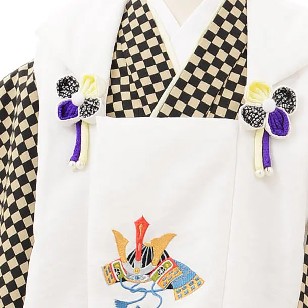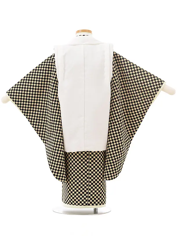 七五三レンタル(3歳男児被布)2497 白兜刺繍×黒ベージュ市松