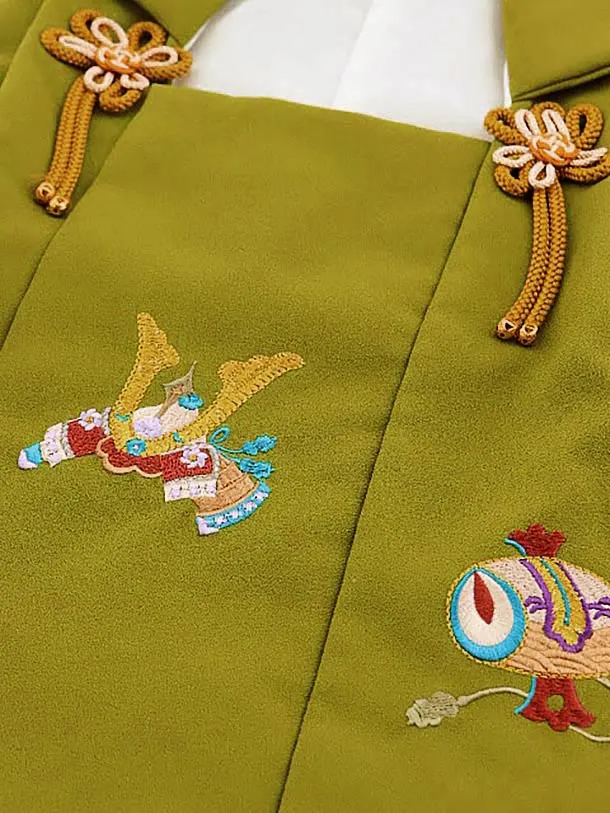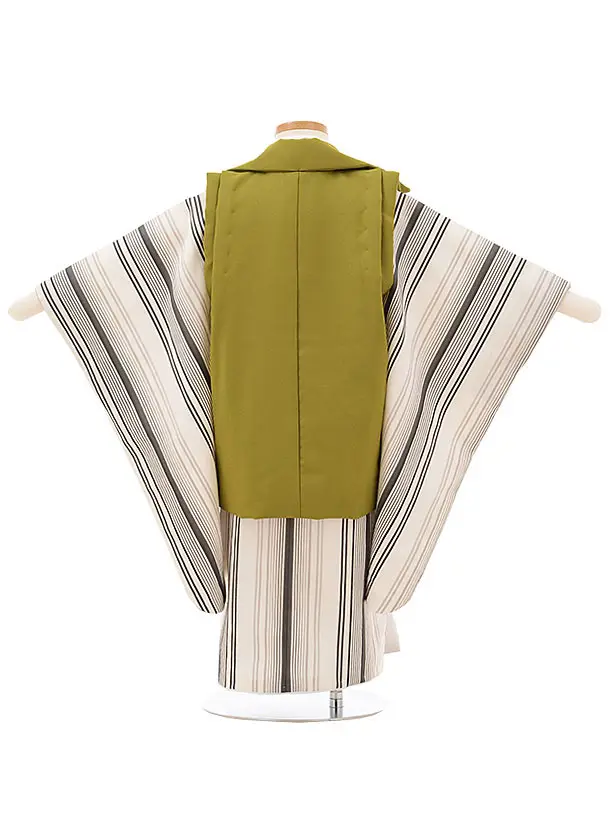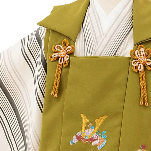 七五三レンタル(3歳男児被布)2536グリーン刺繍兜xオフホワイトストライプ