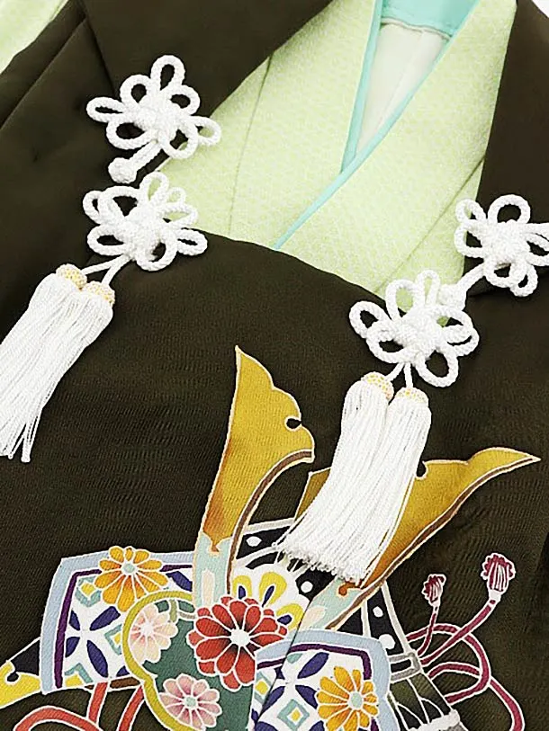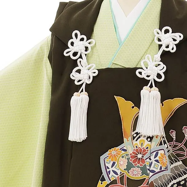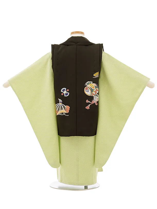 七五三レンタル(3歳男児被布)正絹 2556濃深茶緑兜xパステルグリーン籠目文
