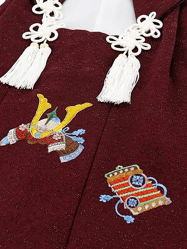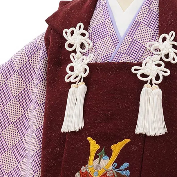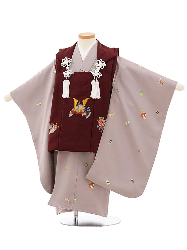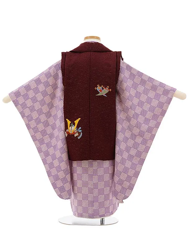 七五三レンタル(3歳男児被布)正絹2566ボルドーラメ刺繍兜xパープル変わり市松
