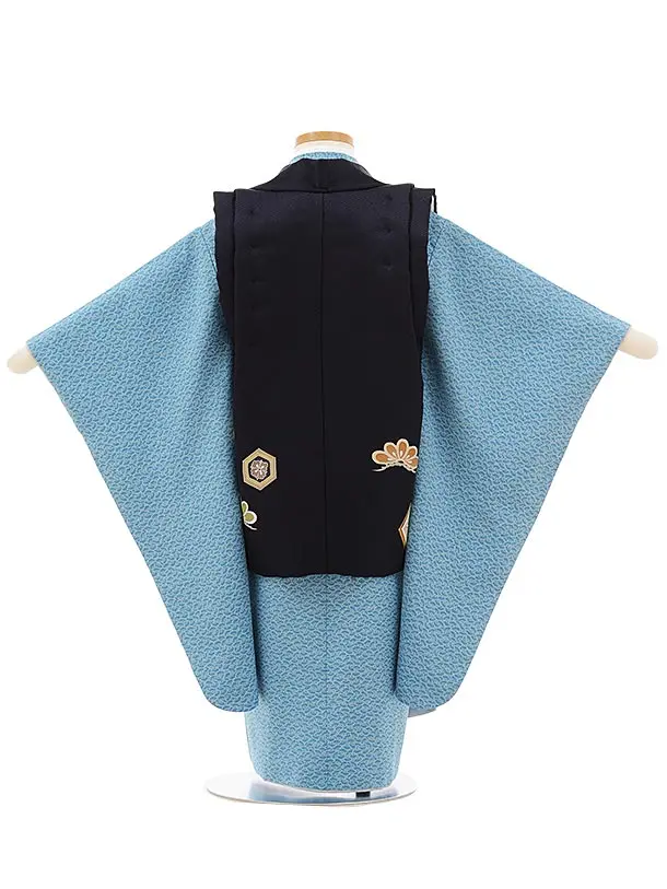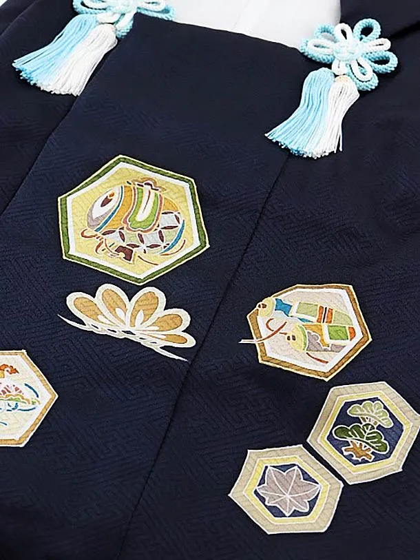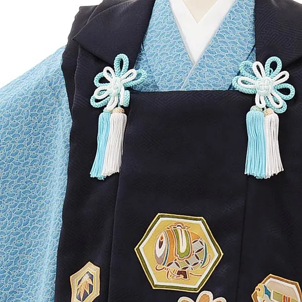 七五三レンタル(3歳男児被布)正絹2570紺地亀甲紋xブルー扇文