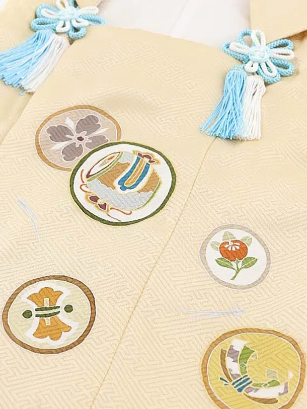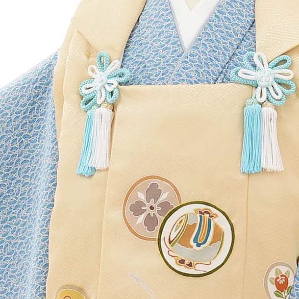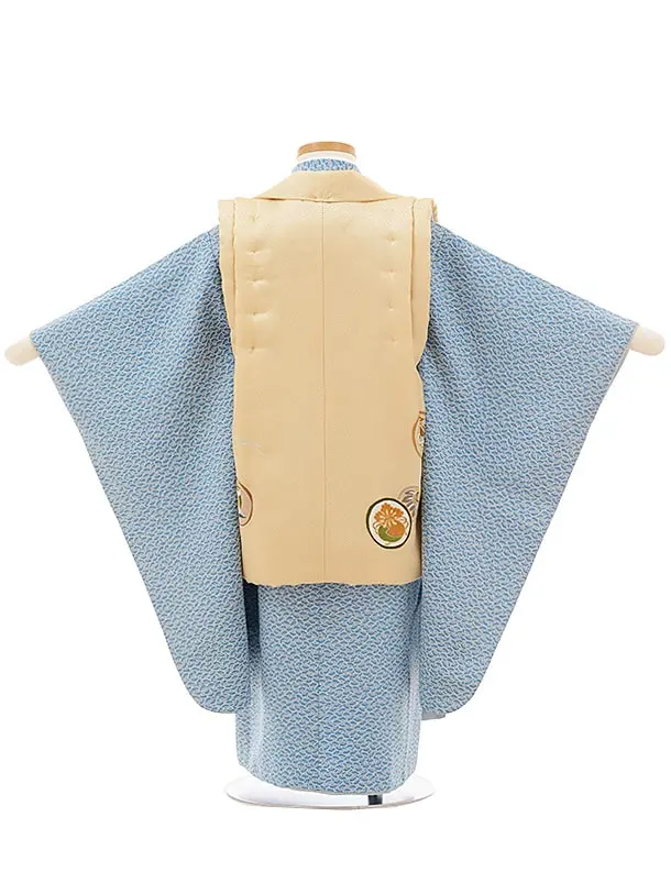 七五三レンタル(3歳男児被布)正絹2573ベージュ丸紋xブルーグレー扇文