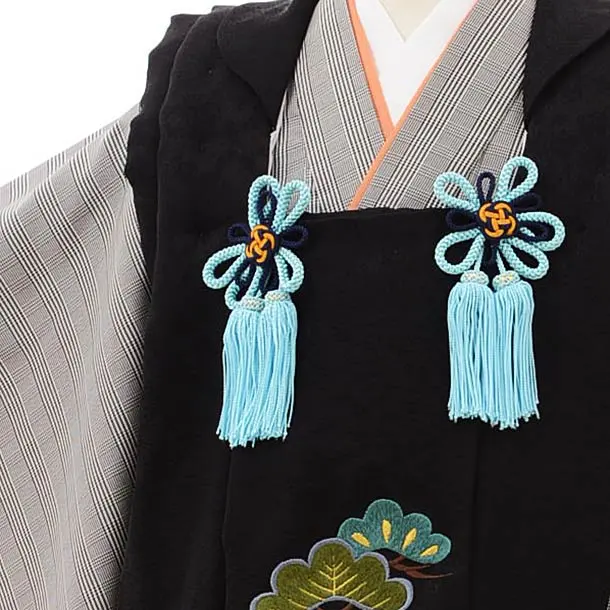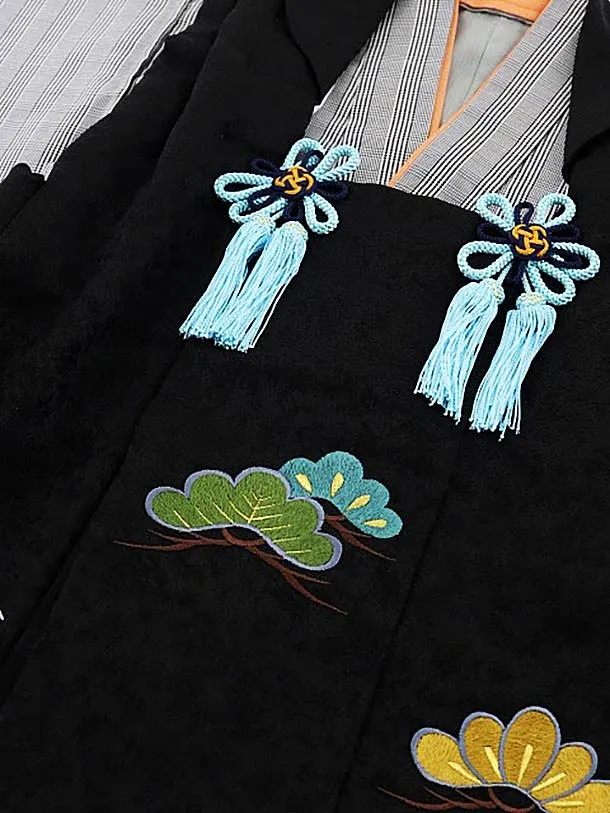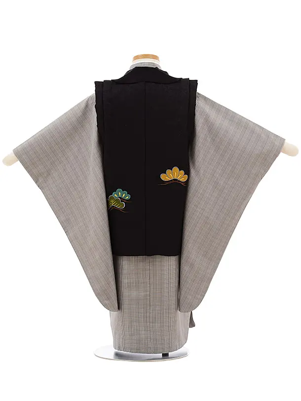七五三(3歳男児被布)高級正絹2574黒刺繍松笹xグレンチェック大島紬