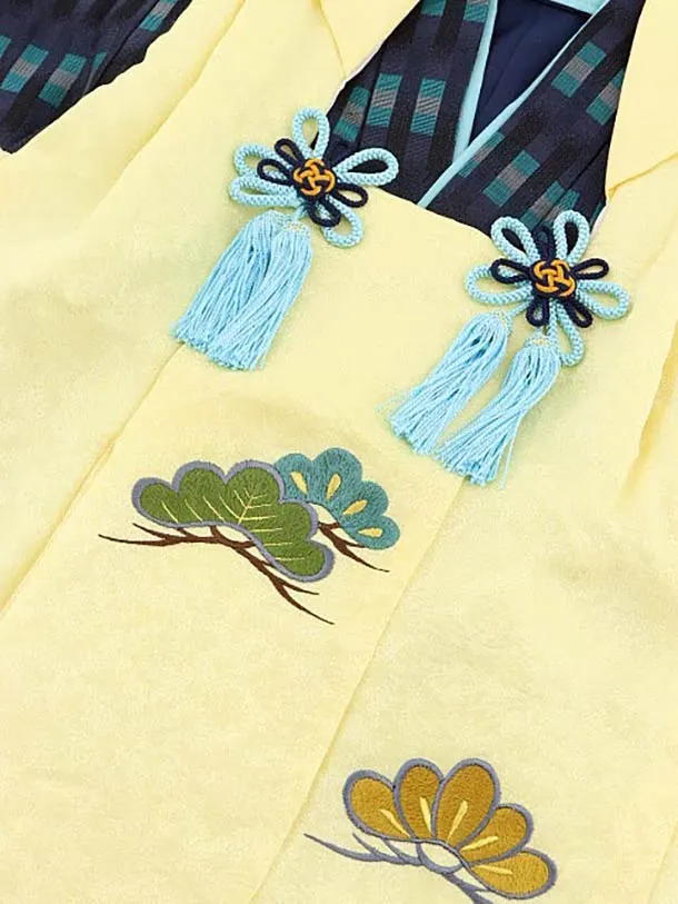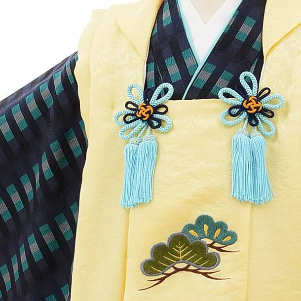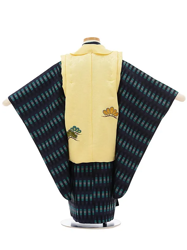 七五三(3歳男児被布)高級正絹2580薄黄色刺繍松笹x紺よろけ織