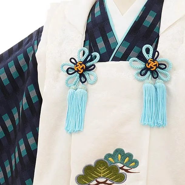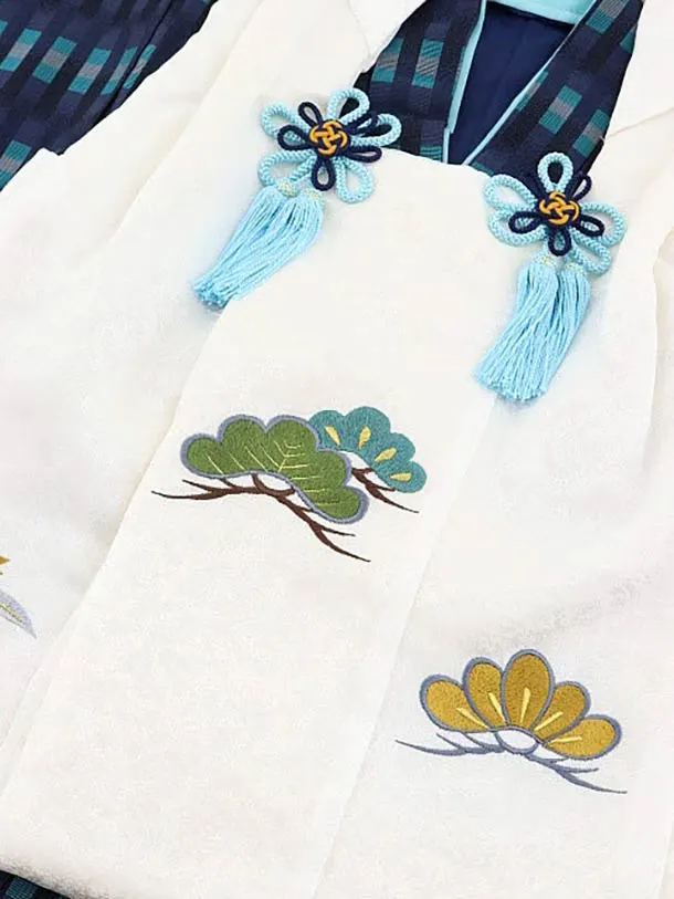 七五三(3歳男児被布)高級正絹2581白刺繍松笹x紺よろけ織
