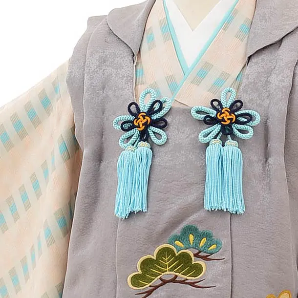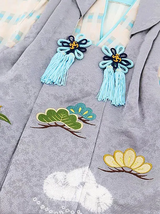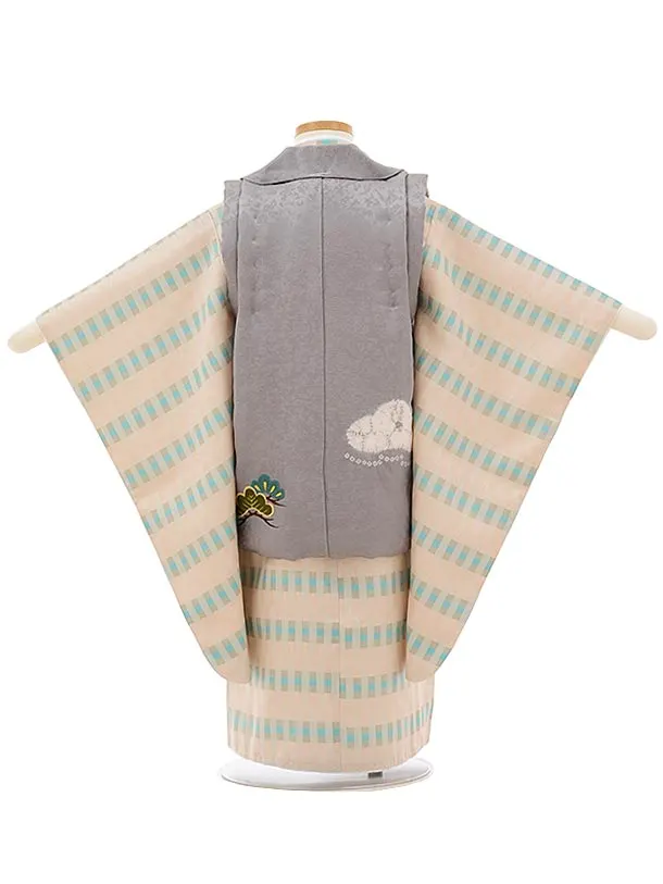 七五三(3歳男児被布)高級正絹2582グレー刺繍松笹xベージュ変わり柄