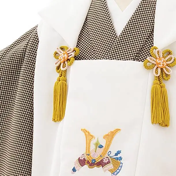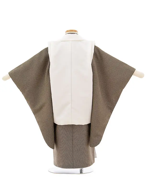 七五三レンタル(3歳男児被布)2605白兜刺繍x黒ベージュ変わりドット