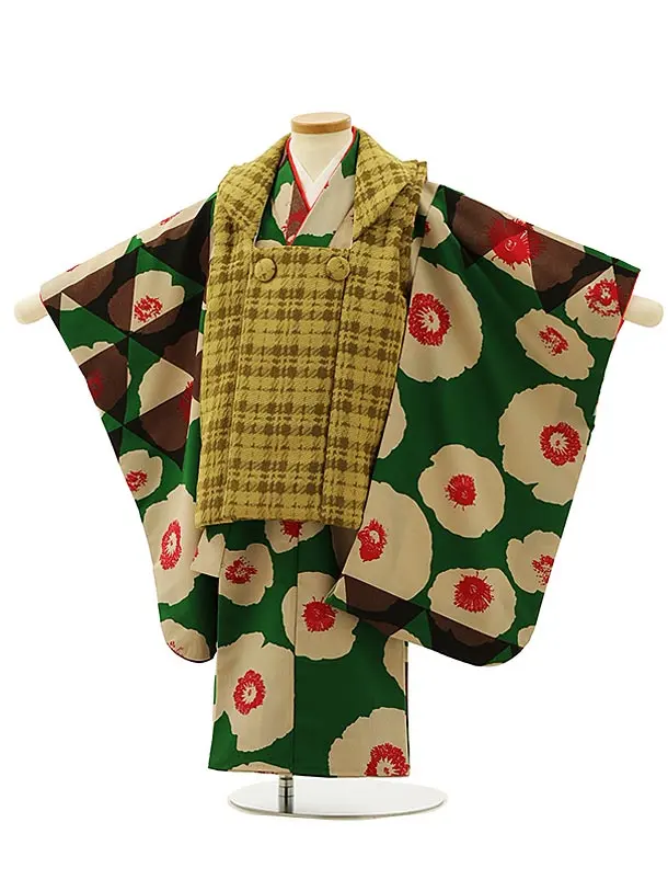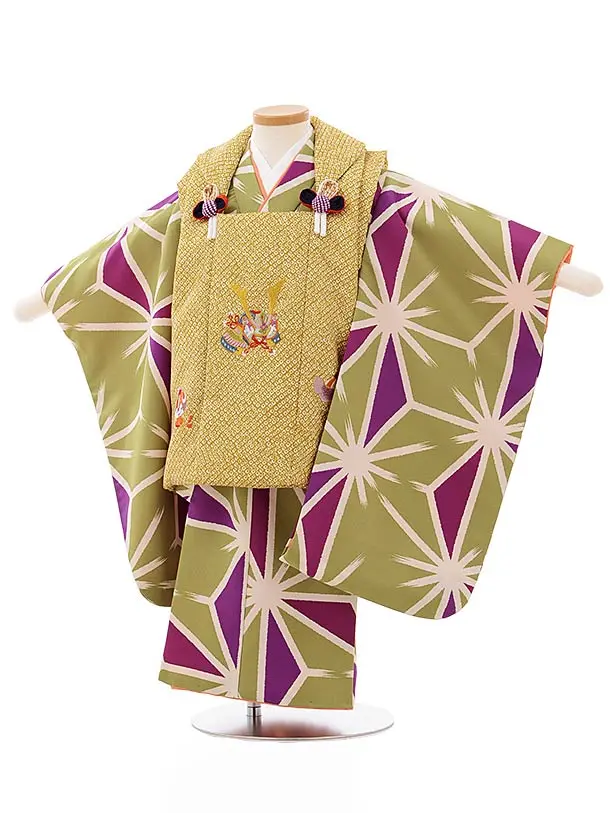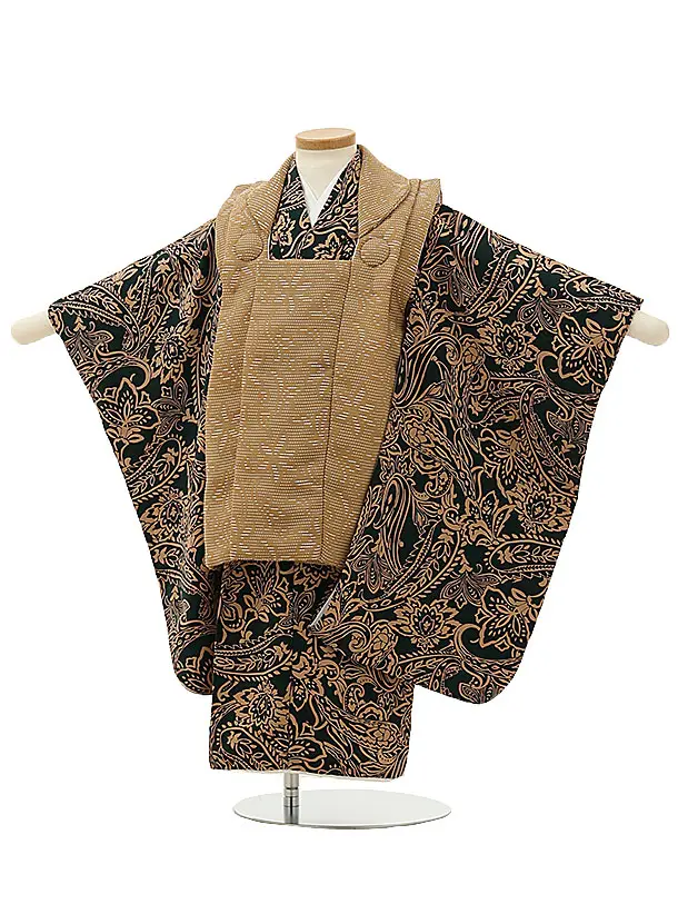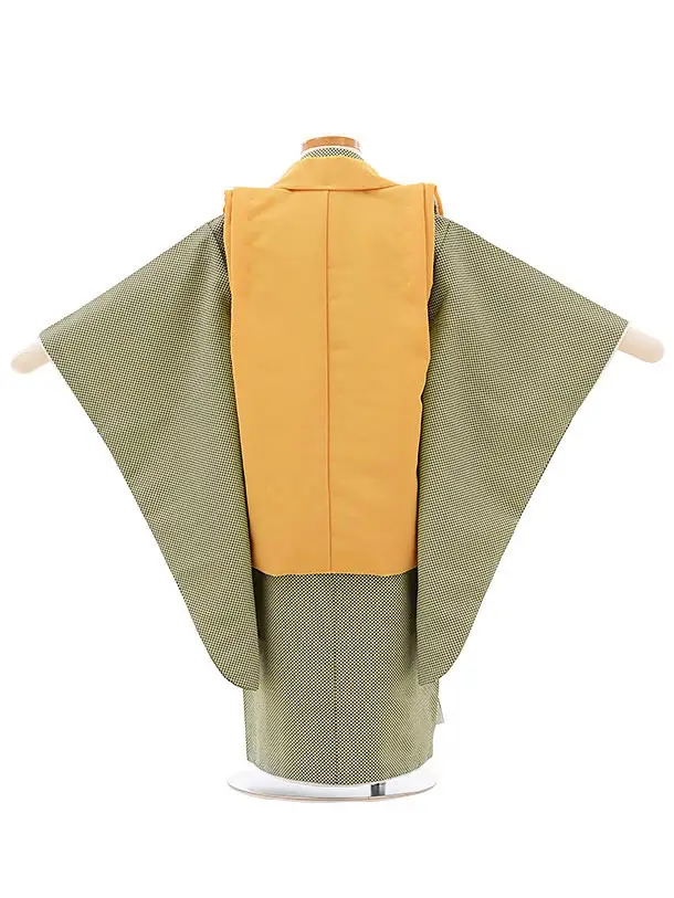 七五三レンタル(3歳男児被布)2606からし色兜刺繍xベージュ深緑変わりドット
