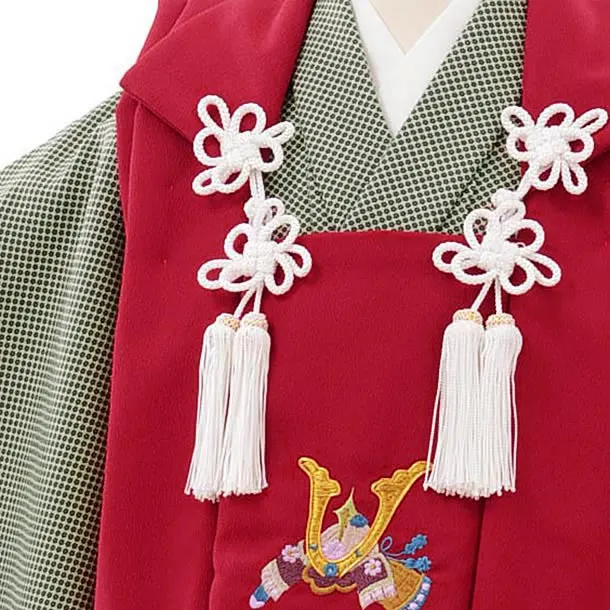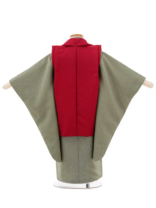 七五三レンタル(3歳男児被布)2607エンジ色兜刺繍xベージュ深緑変わりドット