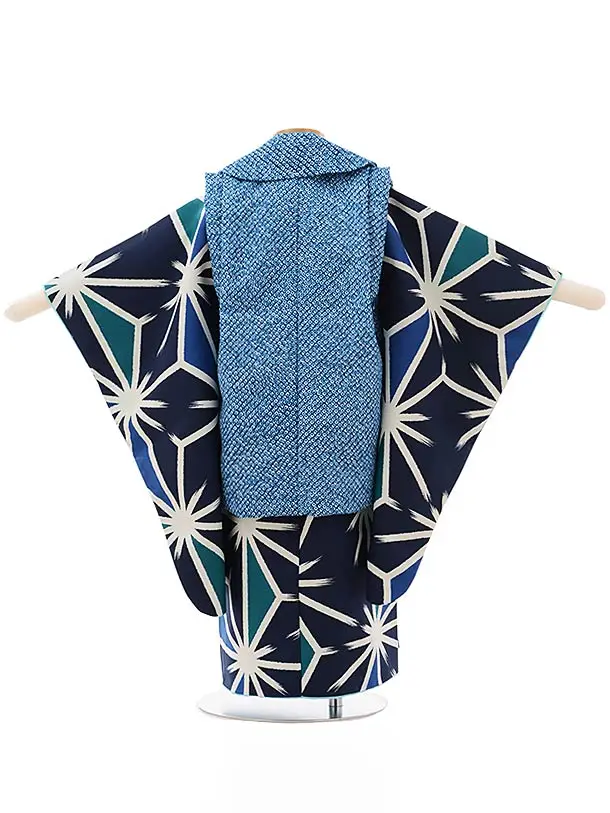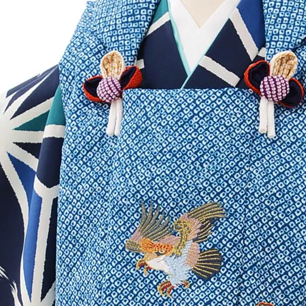 七五三レンタル(3歳男児被布)2624ブルー地鷹刺繍x紺地麻の葉
