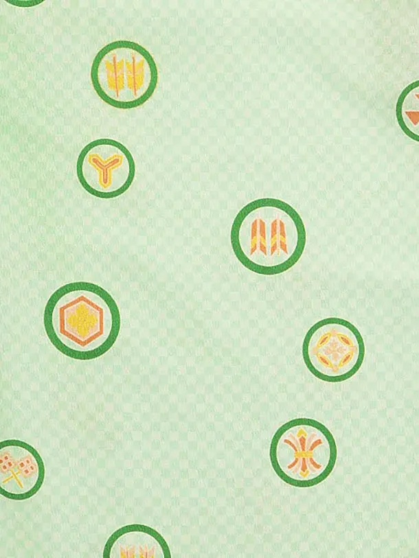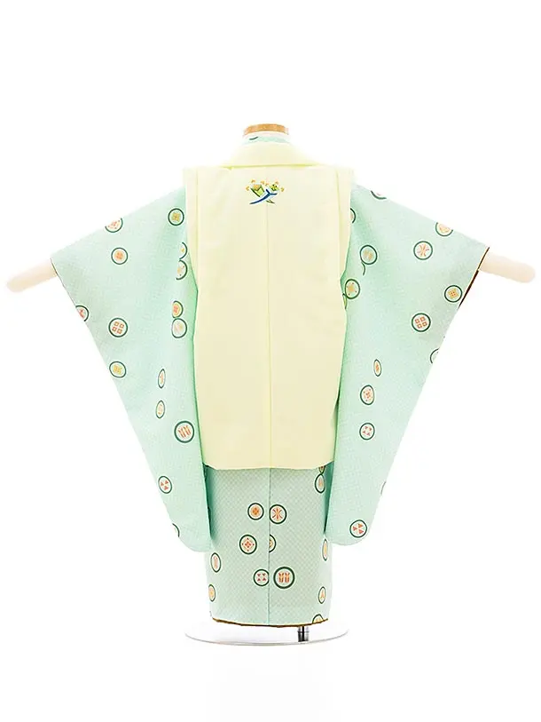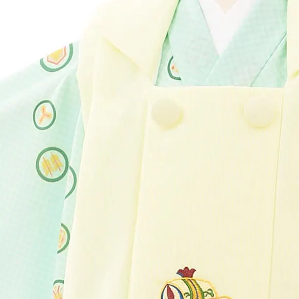 七五三レンタル(3歳男児被布)2648うす黄色刺繍小槌xグリーン市松丸紋